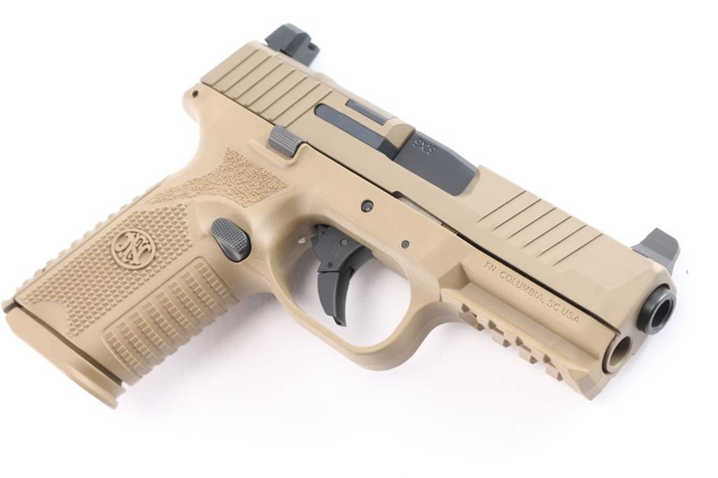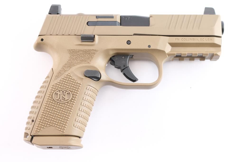 American made semi-automatic striker-fired medium-sized pistol chambered for 9x19mm, manufactured in Columbia, SC. Pistol features a Flat Dark Earth (FDE) polymer frame, a 4" cold-hammer-forged barrel with a target crown, raised dovetailed partially serrated fixed blade front sight, raised dovetailed partially serrated square notched rear sight, smooth two-part safety trigger, checkered ambidextrous magazine release, no manual safety, dual recoil spring assembly, interchangeable backstraps, picatinney rail on dust cover, front and rear slide serrations, optics cut slide with removable plate installed, serrated take-down lever, serrated an ambidextrous slide stop, and FDE polymer grip with stippling and checkering on the grip panels. The slide was given a FDE finish. The approximate FDE slide finish retained is approximately 99% with nothing remarkable. Metal displays no rust or deformation. The action is smooth and crisp, and the polymer is excellent. Bore is bright with strong rifling. Pistol includes original factory cardboard box with end label, soft case, extra backstrap, lock, owner's manual, optic plates with hardware, and two fifteen-round magazines total.