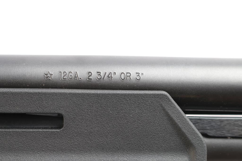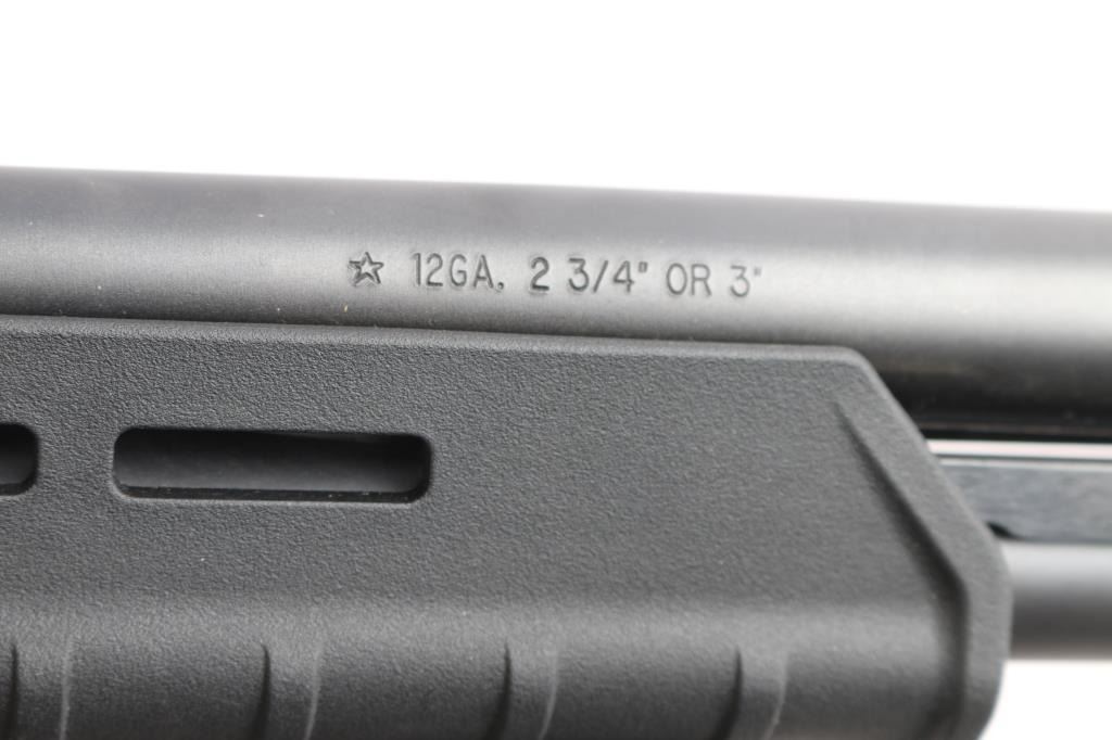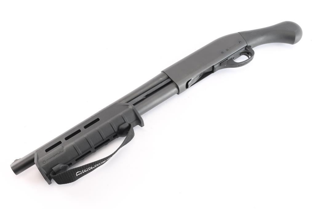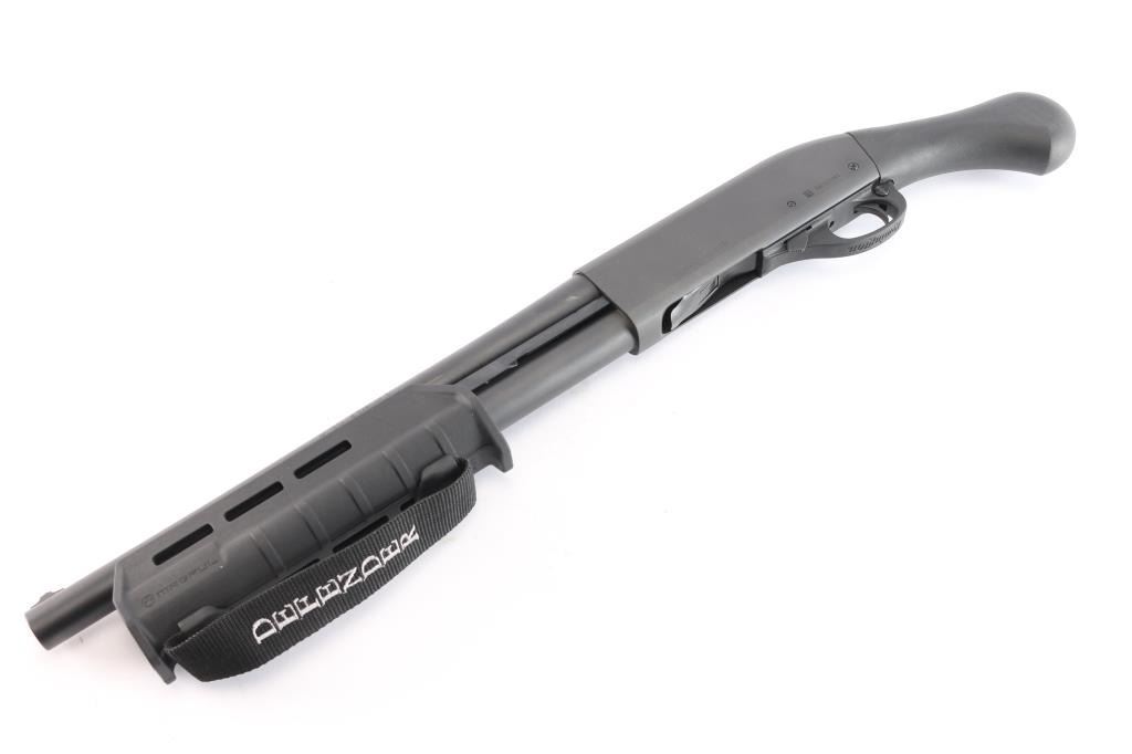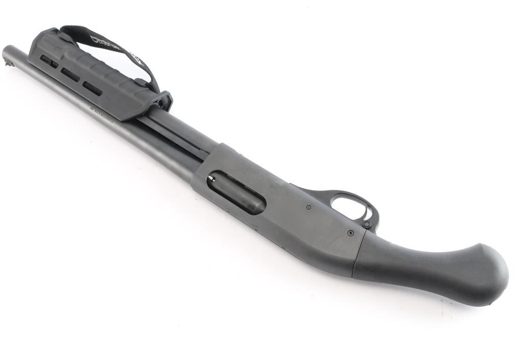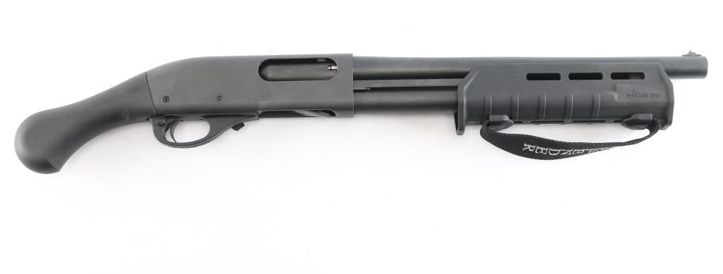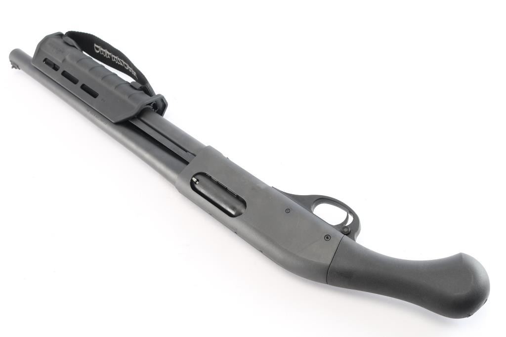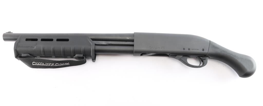 "Tac-14," an American made compact slide action firearm designed for home defense chambered for 3" 12 Gauge shells, manufactured in Ilion, NY. This is a special version of the legendary Model 870, made for tactical purposes. This is a non-NFA firearm and designated as 'Any-Other-Weapon.' Shotgun features a matte black oxide finish, a 14" barrel, bore measures 'CYL' with a drop-in gauge,' raised steel bead front sight, Raptor smooth pistol grip, Magpul MOE slide handle with M-Lok slots and nylon strap, plastic trigger guard, annular cut cross-bolt safety, smooth curved trigger with beveled edges, knurled magazine cap, and a 4+1 magazine capacity. The original matte black oxide finish retained is approximately 99% with a few very light blemishes on the receiver. Metal displays no deformation, but does exhibit rust on the top of the receiver around the front optic mounting screw. The black synthetic furniture is excellent. The action is smooth and crisp, and the bore is bright and shiny. Without the observed rust, this shotgun would be in excellent condition.