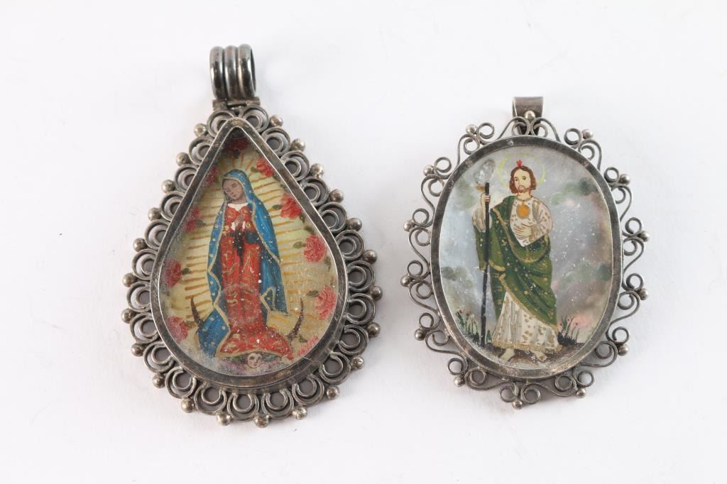 a) hand-painted on shell, the Virgin Mary on beautiful sterling Pendant, marked 950. b) hand-painted shell pendant depicting Jesus Christ, set in sterling silver, marked CP. Total weight with shells is 65 grams.