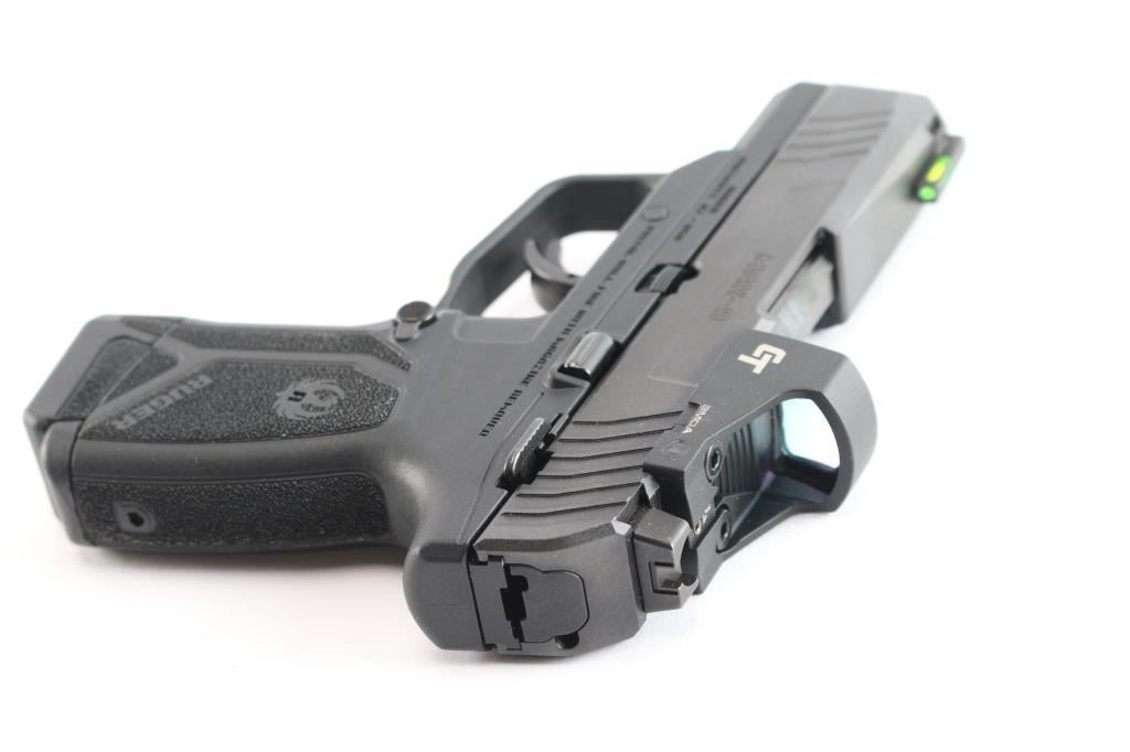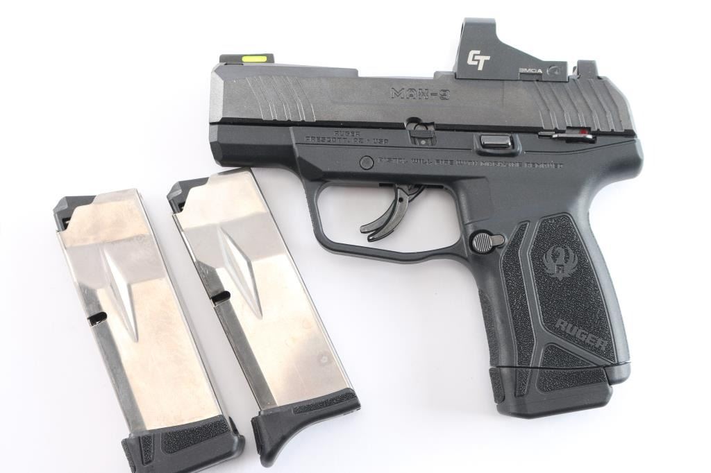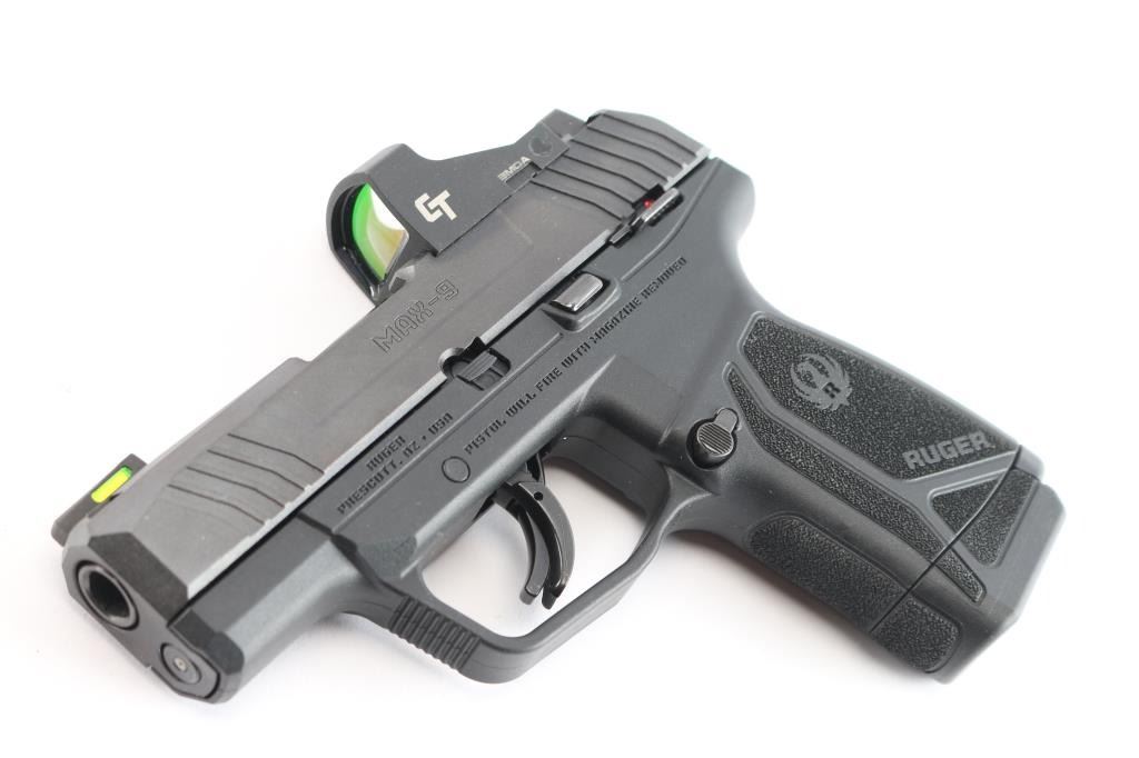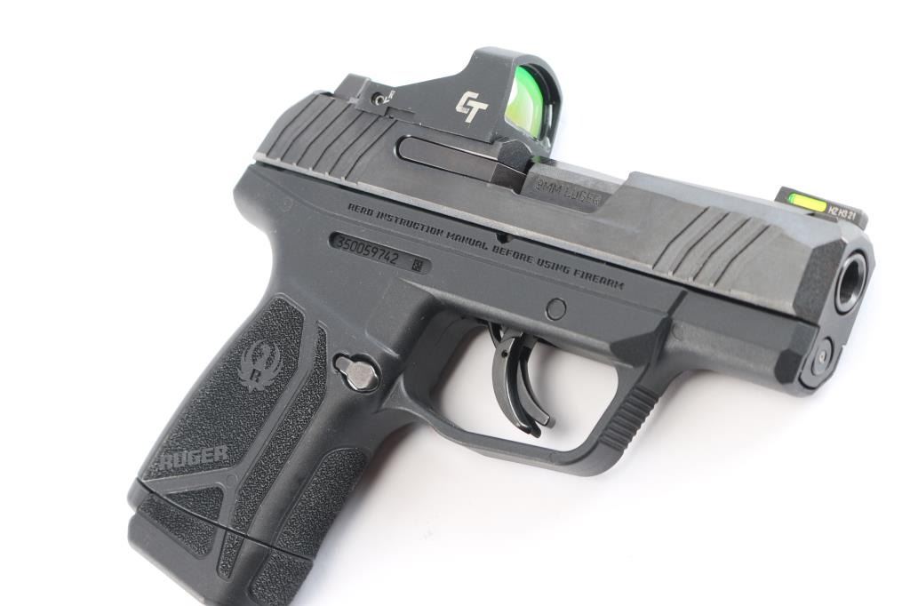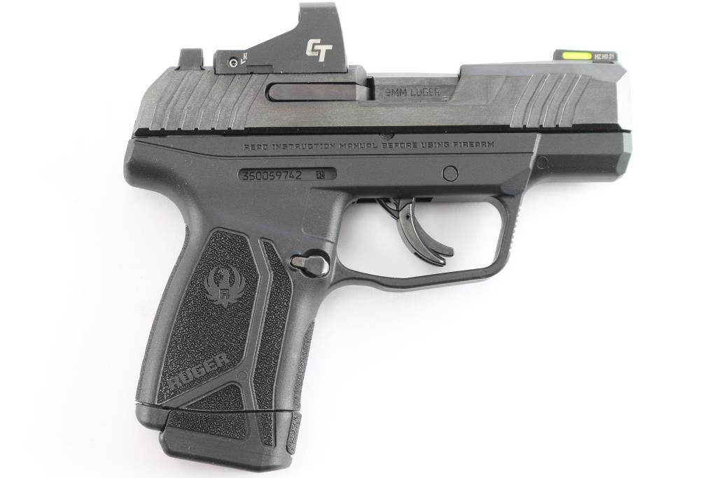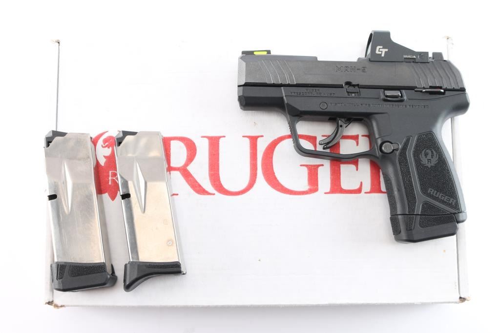 American made striker-fired semi-automatic compact pistol chambered in 9x19mm, manufactured circa 2021 in Prescott, AZ. Pistol features a black oxide finished slide with front and rear cocking serrations, optics cut slide, a 3.2" cold-hammer-forged barrel, dovetailed green tritium/fiber optic front sight, dovetailed square notched rear sight, smooth curved trigger with integral blade safety, metal guide rod assembly with dual recoil springs, serrated thumb safety on the left side of the frame, serrated reversible push-button magazine release, serrated slide stop, undercut trigger guard, textured front trigger guard, and durable stippled black glass-filled nylon frame with Ruger name and logo. A Crimson Trace 3MOA red dot is mounted to the slide, and the optic is functional. The original black oxide finish retained is approximately 99% with nothing remarkable. Metal displays no rust or deformation. Bore has strong rifling, but displays a copper color from a factory metal treatment. The polymer frame is excellent. Action is smooth and crisp. Pistol includes original foam lined factory cardboard box, three ten-round magazines total, owner's manual, sticker, cable lock, lens cloth, tools, magazine floorplate, and optics plate with hardware.