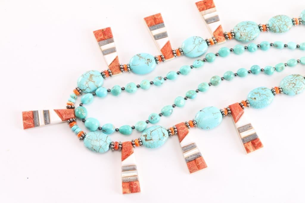 A) single strand light blue turquoise and silver beaded necklace, measures 14" from clasp to bottom; B) turquoise and shell beaded necklace, Santo Domingo type, shows mother of pearl and coral accents, measures 11.5" from drop.