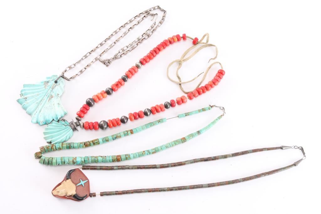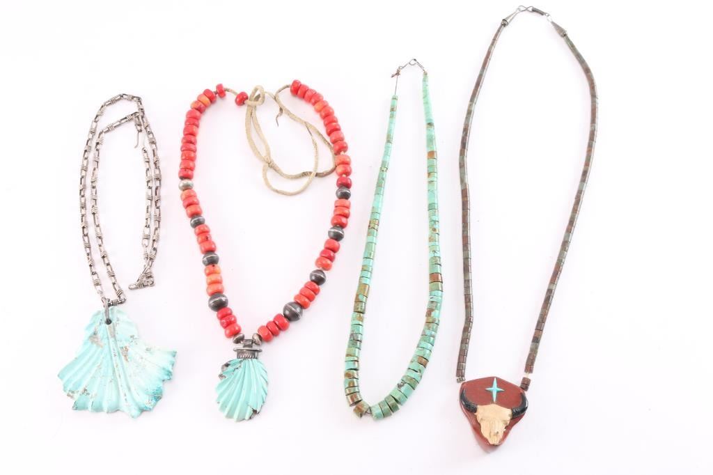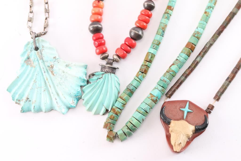 Including: a Lynn Phippen buffalo skull catlinite, turquoise and stone pendant on brown heishi beaded necklace; a turquoise shell pendant on chain, graduated turquoise heishi necklass; and a coral and navajo beaded necklace with turquoise shell pendant.