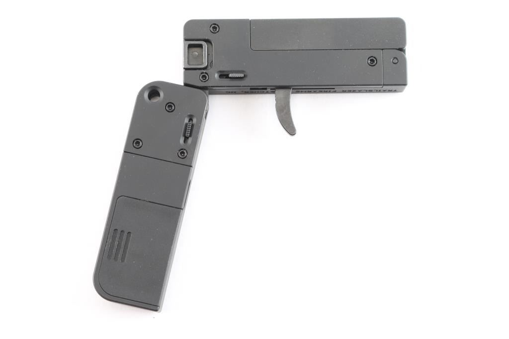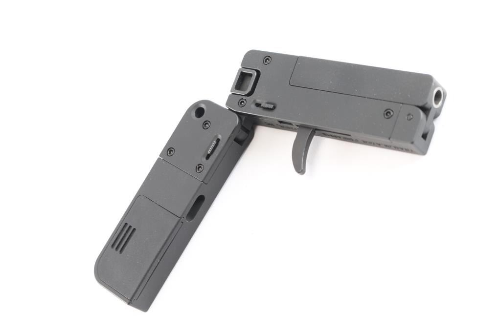 Unique & discreet American made single-action single-shot pistol chambered in .22 Magnum. Manufactured in Fletcher, NC. Pistol has the ability to fold to the size of a stack of credit cards. Pistol features a steel & aluminum construction with a matte black finish, 2-1/2” tip-up barrel, full-length grooved frame sight, linear hammer with bolt tabs on the rear, thin smooth curved trigger, smooth aluminum grip, and three-round storage compartment. The original matte black finish retained is approximately 99% with nothing remarkable. Metal displays no rust or deformation. The action is smooth and crisp, and the bore is bright with strong rifling. The frames grip is also excellent. Pistol includes the original factory cardboard box, documents, and pad lock with keys.