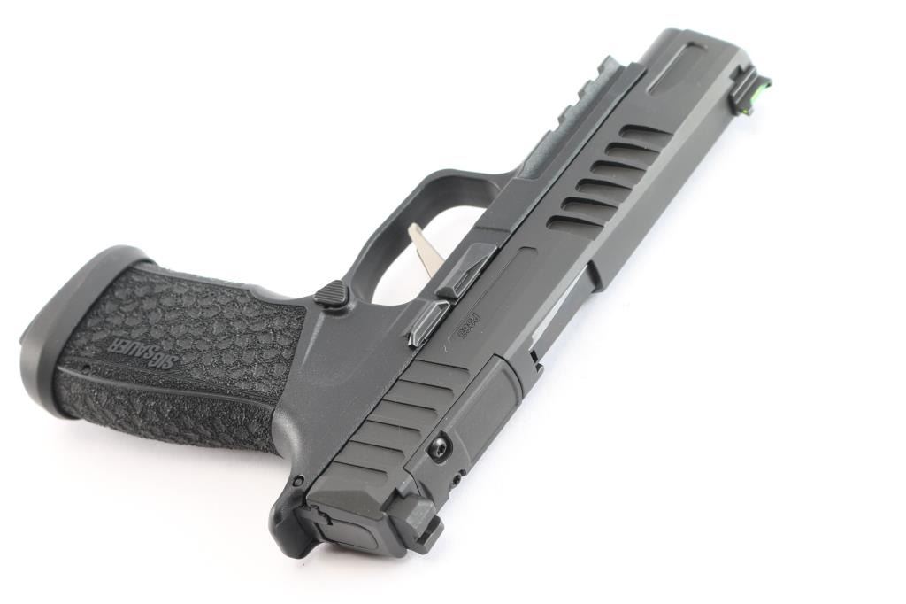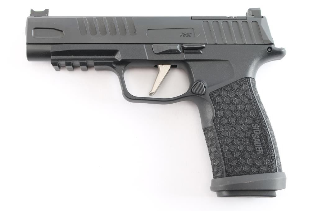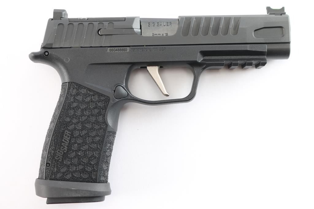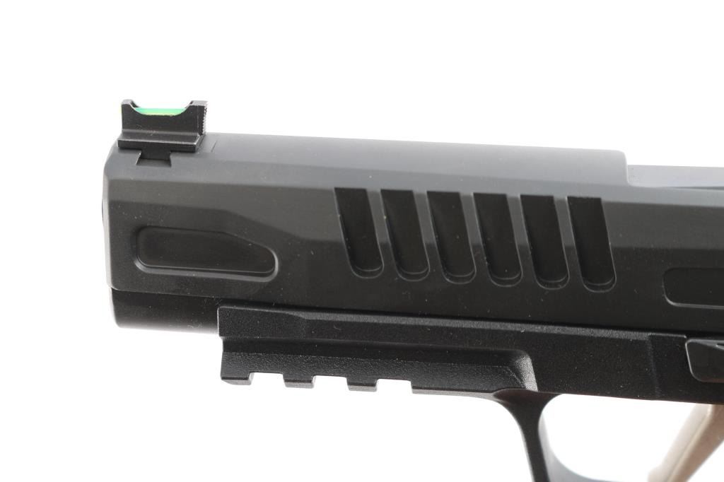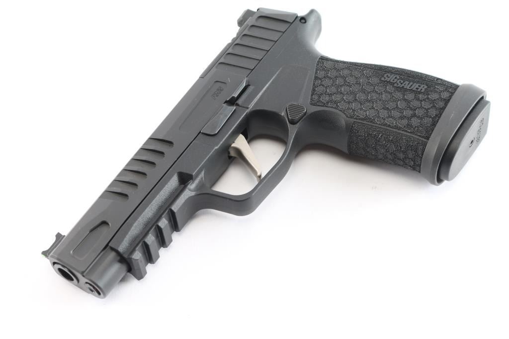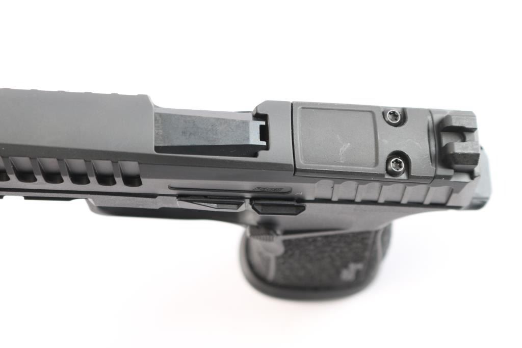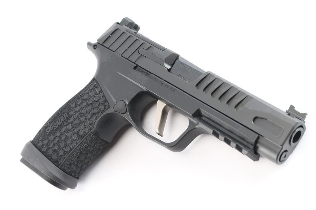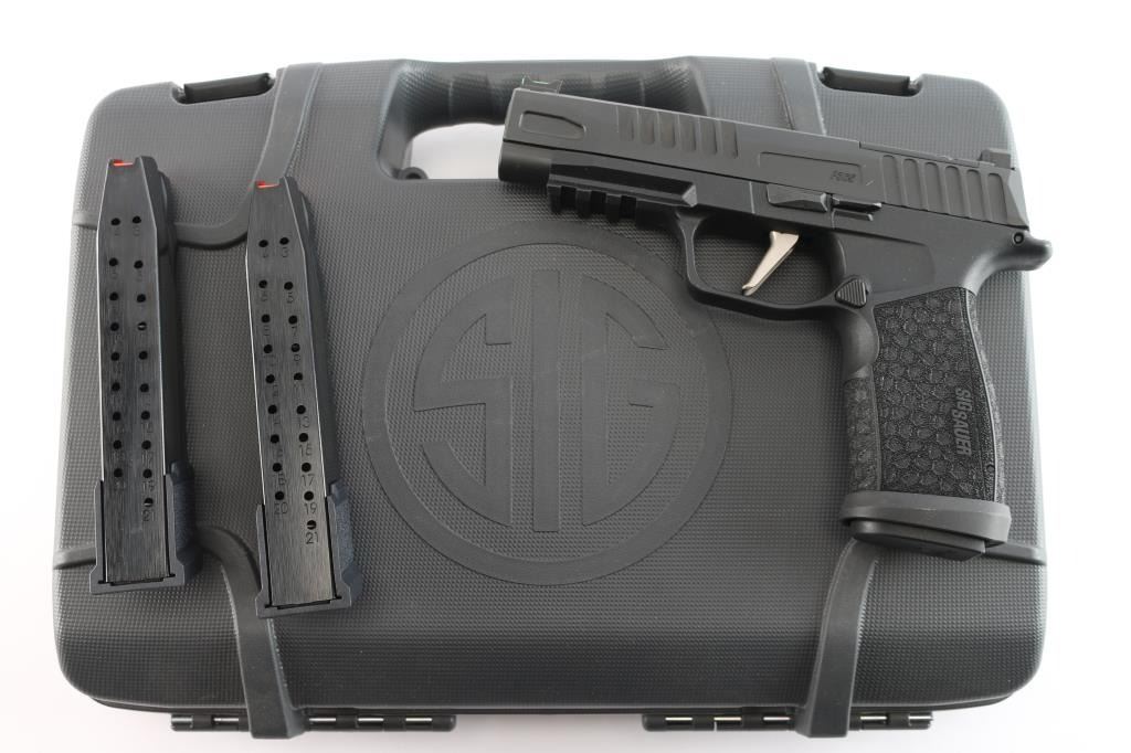 American made modular striker-fired semi-automatic sub-compact pistol chambered in 9x19mm. Manufactured in Newington, NH circa 2024. Pistol features a black Nitron finished stainless steel slide, 4.3" barrel with loaded chamber viewing port, front and rear slide cocking serrations, plastic guide rod assembly with flat recoil spring, dovetailed green fiber optic front sight, dovetailed serrated notched rear sight, accessory rail on dust cover, optics cut slide with slide plate installed, nickel plated smooth flat-faced trigger, serrated push-button magazine release, factory seventeen-round and twenty-one-round magazines, magazine funnel, stainless steel insert (the frame or firearm in modular pistols), and Polymer LXG Grip Module With Laser Engraved Texture and undercut trigger guard. Pistol retains approximately 99% of its original Nitron finish with only superficial blemishes. Metal displays no rust or deformation. The action is smooth and crisp, and the bore is bright with strong rifling. The polymer grip module is also excellent. Includes the original factory foam lined hard case with matching end label, documents, sticker, three OEM magazines total, two extra backstraps, extra fiber optic inserts, and lock.