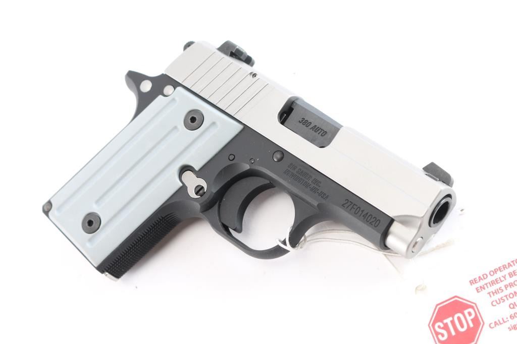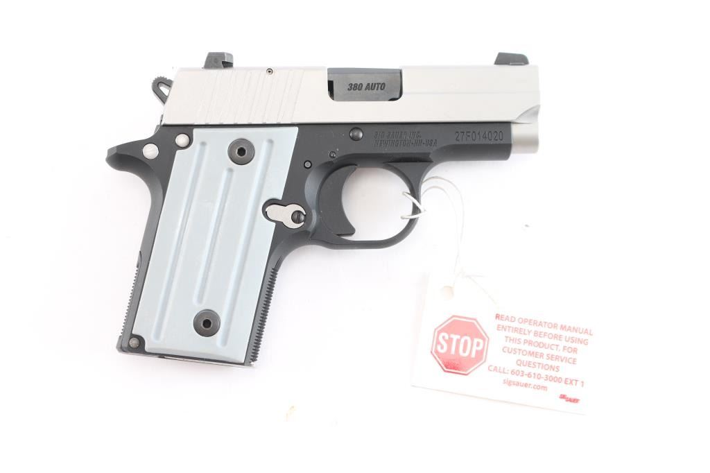 American made sub-compact single-action semi-automatic pistol chambered for .380 Automatic Colt Pistol, manufactured circa 2024 in Newington, NH. Pistol features a two-toned finish with a matte stainless slide and matte black frame, a 3" barrel, dovetailed 3-dot SIGLIGHT night sights, serrated frame mounted manual safety, solid serrated curved trigger, full-length metal guide rod with flat recoil spring, external skeletonized hammer with serrated spur, serrated push-button magazine release, loaded chamber indicator, checkered front strap, beveled magazine well, magazine disconnect, checkered mainspring housing, and two-piece gray fluted polymer grips. Pistol retains approximately 99% of its original matte black finish with nothing remarkable. Metal displays no rust or deformation. The action is smooth and crisp. The bore is bright with strong rifling. The polymer grips are also excellent. Pistol includes the original factory foam lined hard case with matching end label, one OEM magazines total, sticker, owner's manual, and lock.