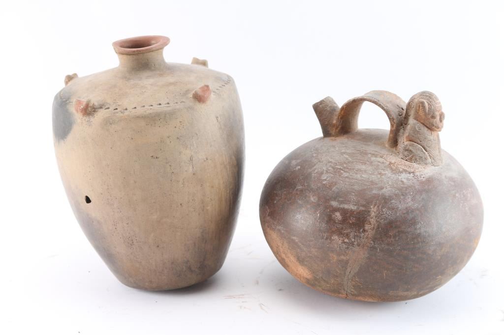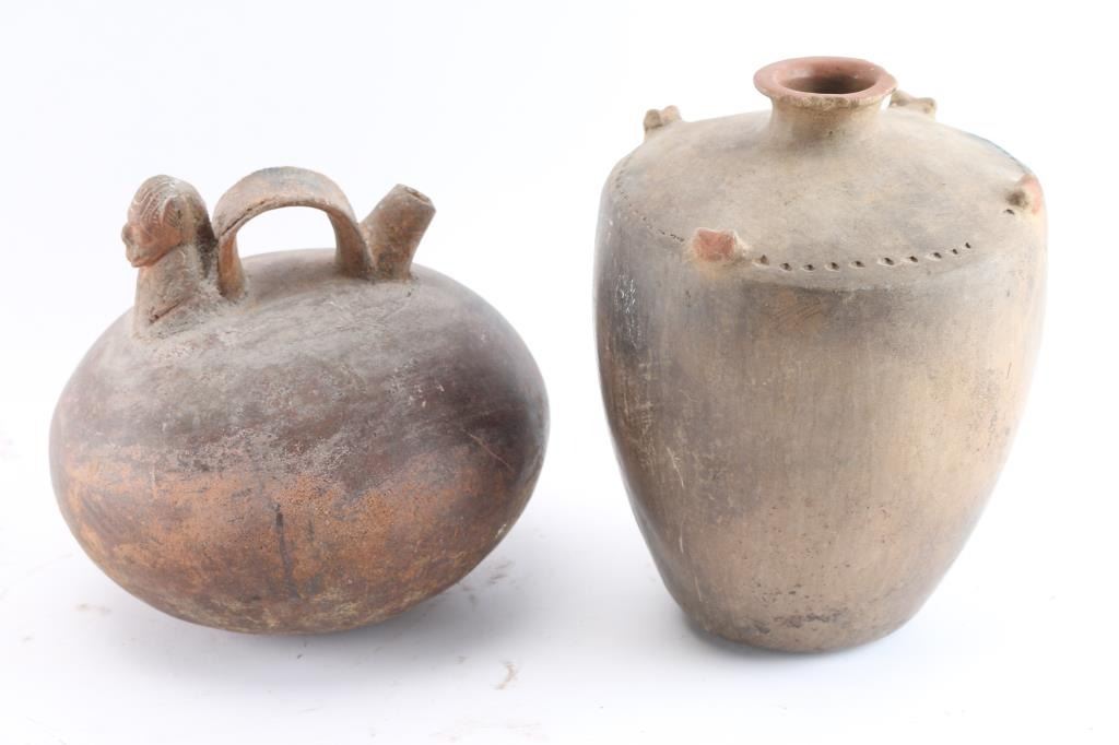 Handled effigy pot, 7" diameter; a vase, 6" diameter, shows heavy losses to rim. Unknown age and origin.