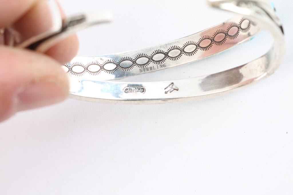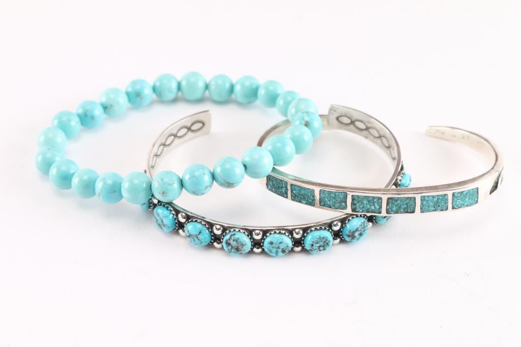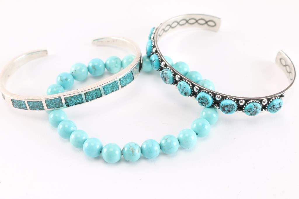 Includes: a 9 stone turquoise bracelet set in sterling silver, 8.5" including gap; a Zuni inlaid turquoise cuff set in sterling silver, 8" including gap; round turquoise beads on stretchy string bracelet.
