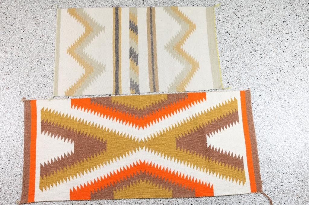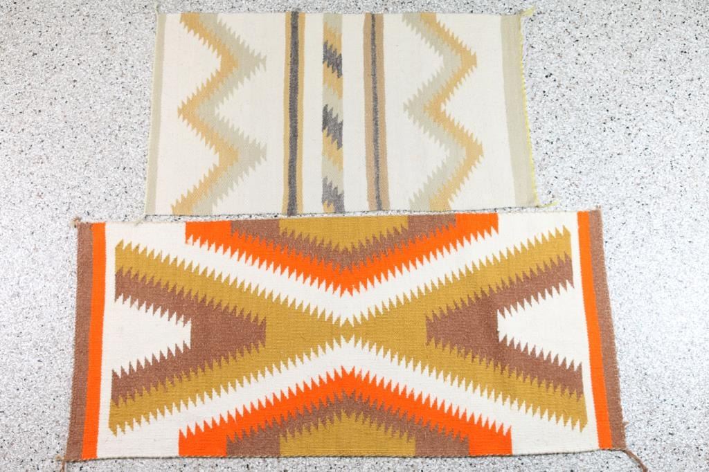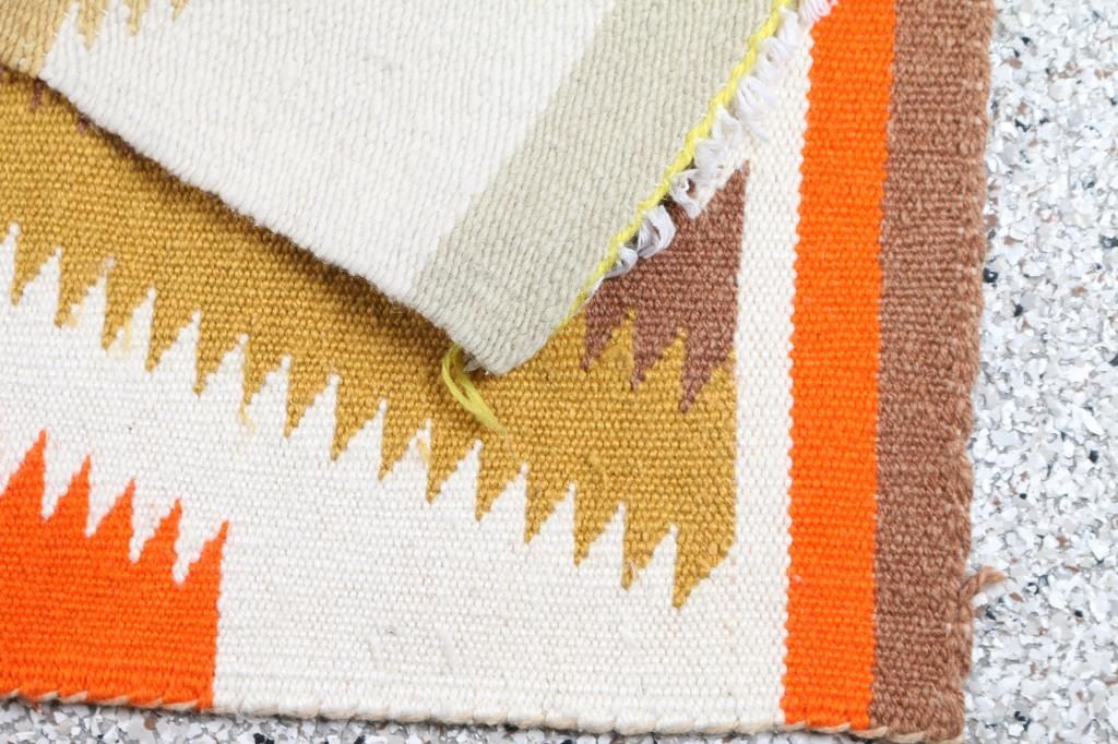 Small runner in mustard yellow, orange and brown, 46" x 21"; and a small rug with chevron pattern in cream, yellow and grey, 35" x 20"