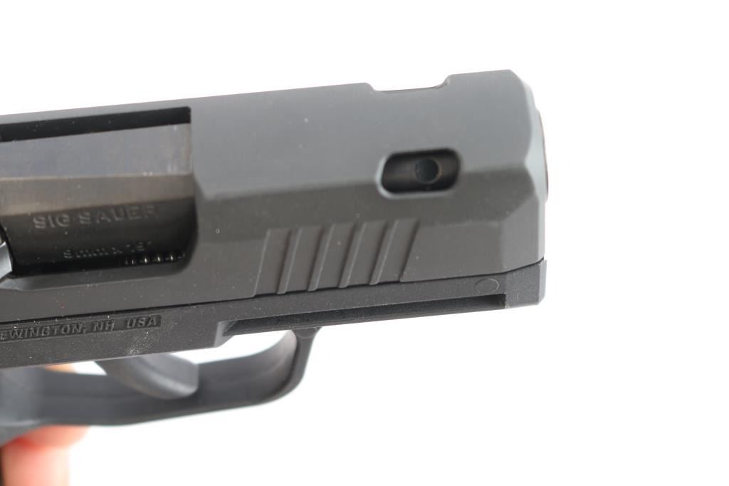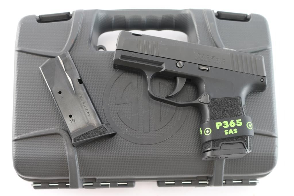 ‘SIG Anti Snag,’ an American made modular striker-fired semi-automatic sub-compact pistol chambered for 9x19mm (rated for +P loads), manufactured circa 2020 in Newington, NH. The SAS model is a conceal carry optimized pistol with features designed for smoother draws and faster sight acquisition. Pistol features a black Nitron finished stainless steel ported slide, front and rear cocking serrations, SIG Anti-Snag treatment, 3.1" ported barrel with loaded chamber viewing port, captured recoil spring, flush-mounted FT Bullseye Fiber-Tritium night sight, smooth curved trigger, flush fit controls, smooth push-button magazine release, factory ten-round magazines, stainless steel insert, integral accessory on dust cover, and stippled black polymer grip module with Sig insignias. Pistol retains approximately 99% of its original black Nitron finish with superficial scratches. Metal displays no rust or deformation. The action is smooth and crisp. The bore is dirty, but bright with strong rifling. The polymer grip module is also excellent. Pistol includes the original factory foam lined hard case with matching end label, two OEM magazines total, owner's manual, and extra floorplate.