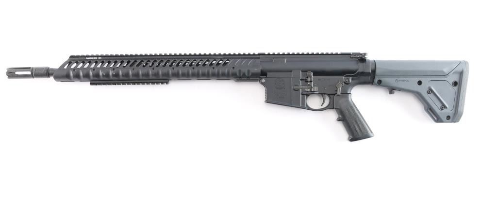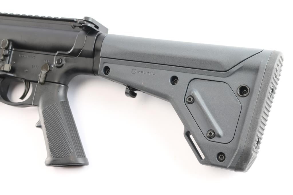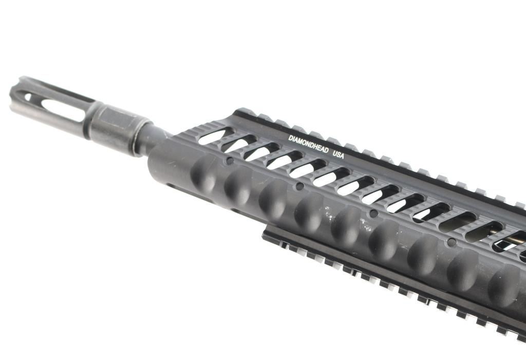 American made semi-automatic centerfire gas-impingement rifle chambered for .308 Winchester, and manufactured in Springfield, MA. Rifle features a matte black anodized finish, 18" 5R rifled barrel with a 1/10" twist rate, crowned slotted flash suppressor, T-marked flat top upper receiver, annular cut bolt assist, ambidextrous magazine release with an annular cut push-button on the right side and serrated paddle on the left side, single-stage smooth curved trigger, standard charging handle, 16-1/2" aluminum Diamondhead free-float rail with an integral picatinney rail on top, Diamondhead rail is drilled and tapped for rail segment mounting, picatinney section attached on the bottom of Diamondback rail, A2 style checkered pistol grip, integral oversized trigger guard, ambidextrous receiver mounted serrated manual safety, beveled magazine well, shell deflector, Magpul proprietary receiver extension, and gray Magpul UBR eight-position stock with black serrated rubber recoil pad and QD sockets. Rifle retains approximately 97% of its original anodized black finish with scattered light scratches, a couple of nicks, handling marks on the handguard's top rail, and white material transfer on the left side of the hand guard. Metal displays no rust or deformation. The action is smooth and crisp, and the bore is bright with strong 5R rifling. The polymer furniture is also excellent with superficial blemishes.