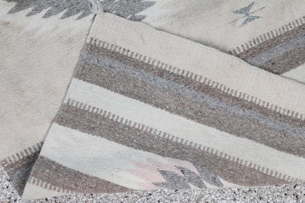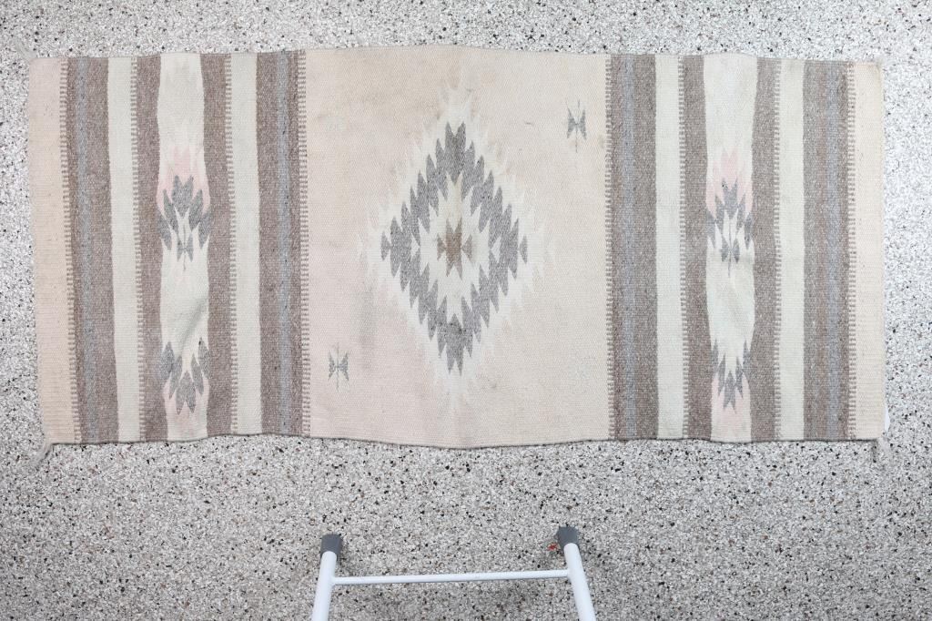 With crystal design, pastel colors: grey white, pink. 57 1/2" x 25 1/2". Condition is fair, shows scattered staining.