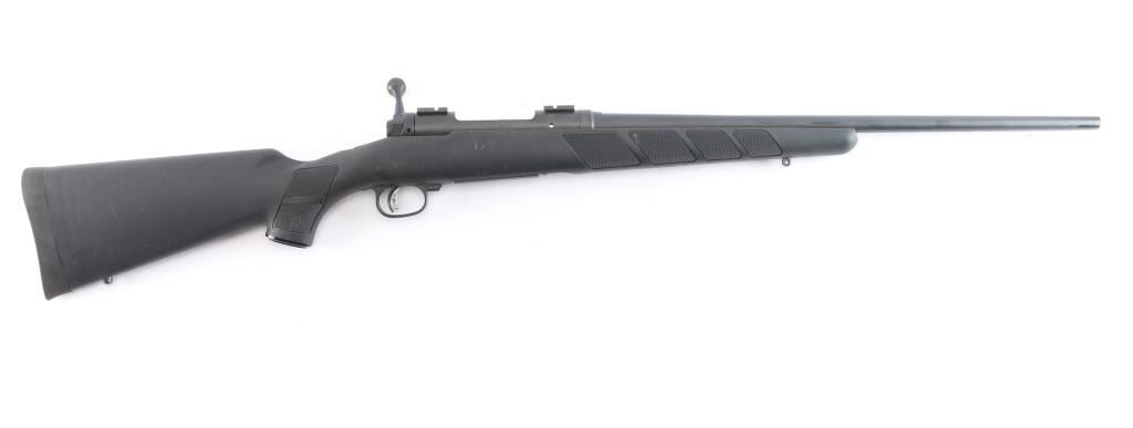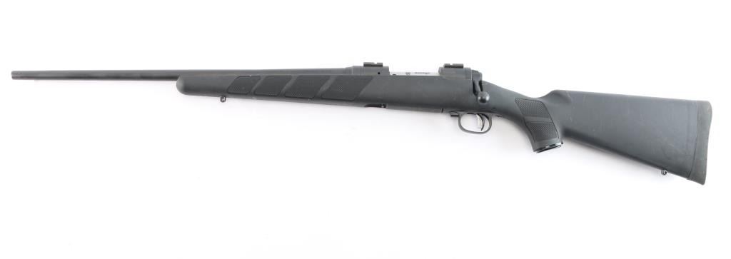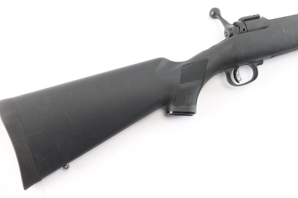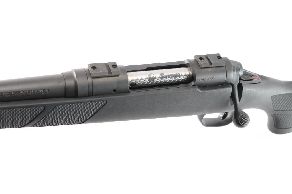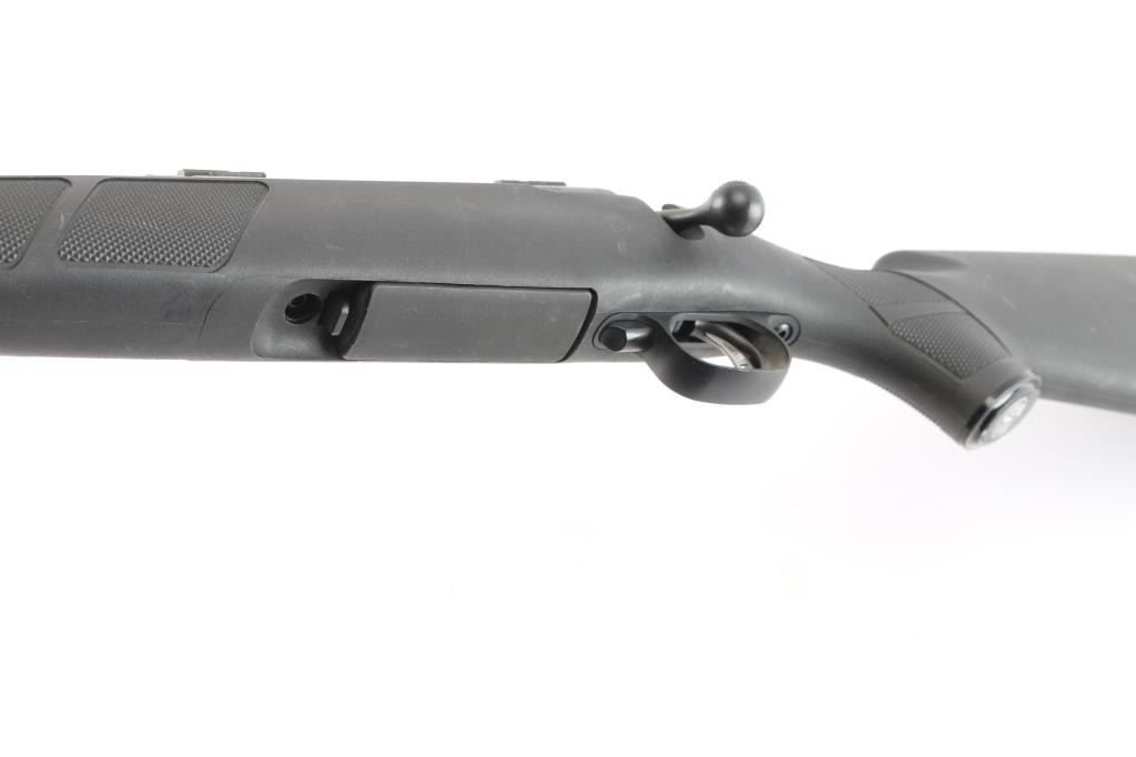A left handed American made centerfire bolt-action rifle chambered for 7mm-08 Remington, and manufactured in Westfield, MA. Rifle features a matte blued finish, a 22" free-floated tapered barrel, receiver drilled and tapped for optic mounting, turned down bolt handle with a checkered knob, 4+1 total capacity, no provisions for iron sights, two-lug bolt with jeweled bolt body, detachable magazine, serrated sliding three-position tang safety, adjustable smooth single-stage Accu-Trigger with integral blade safety, and installed scope rail sections on the receiver. The black synthetic furniture consists of a semi-pistol grip shoulder stock with checkering at the wrist, checkered black plastic grip cap with silver Savage trademark, checkered forend with sling stud, sling stud on the bottom of the shoulder stock, and a solid black rubber recoil pad. Rifle retains approximately 98% of its original blued finish with some edge wear, and light scattered scratches. Metal displays no rust or deformation. The action is smooth and crisp, and the bore is bright with strong rifling. The polymer furniture is also very good with light scattered scratches and blemishes.