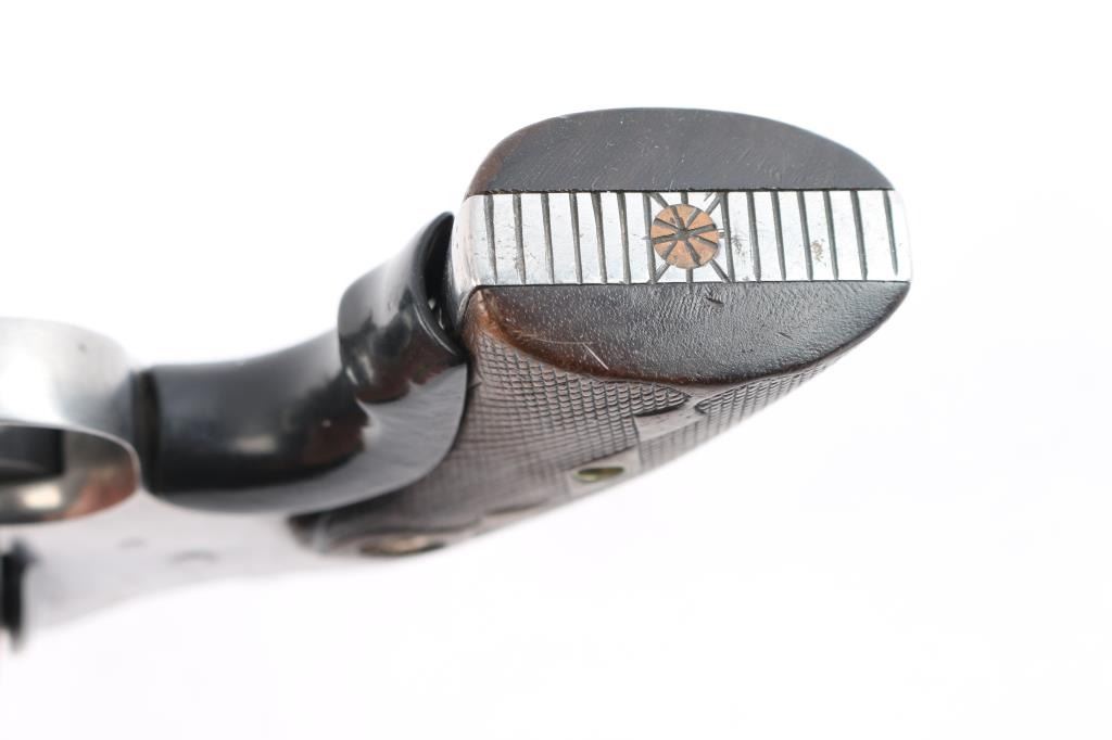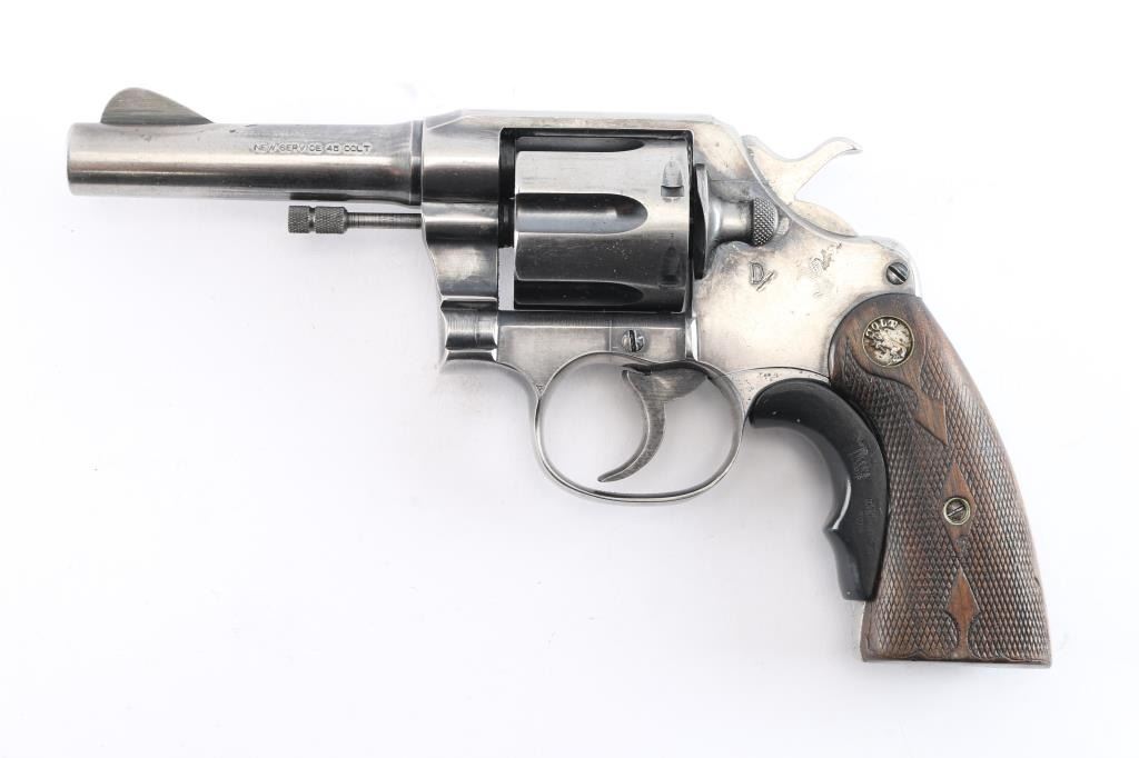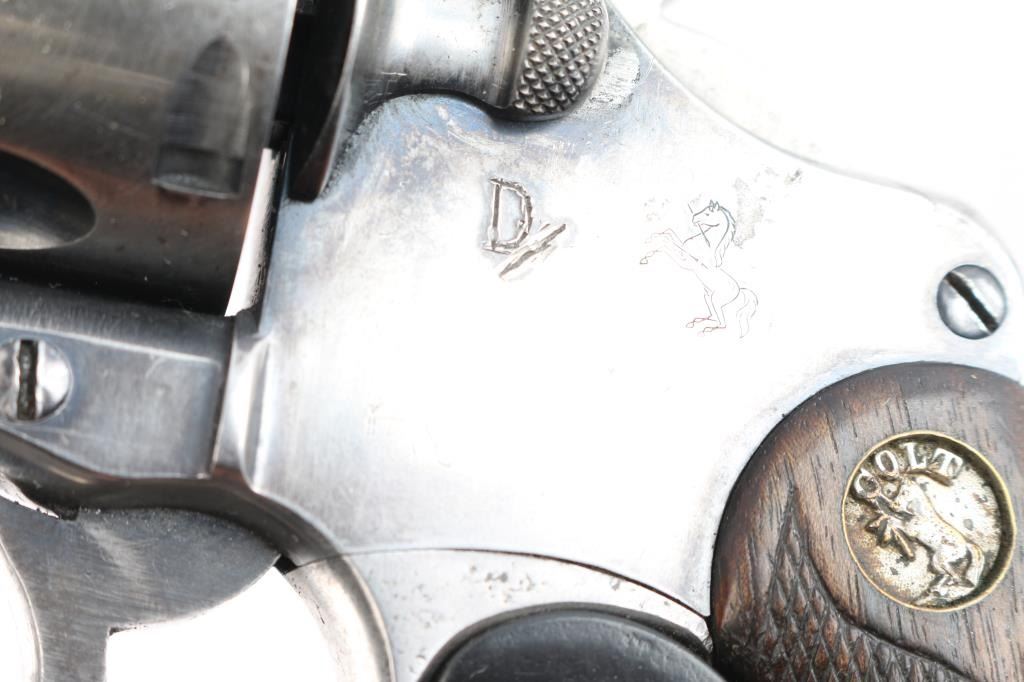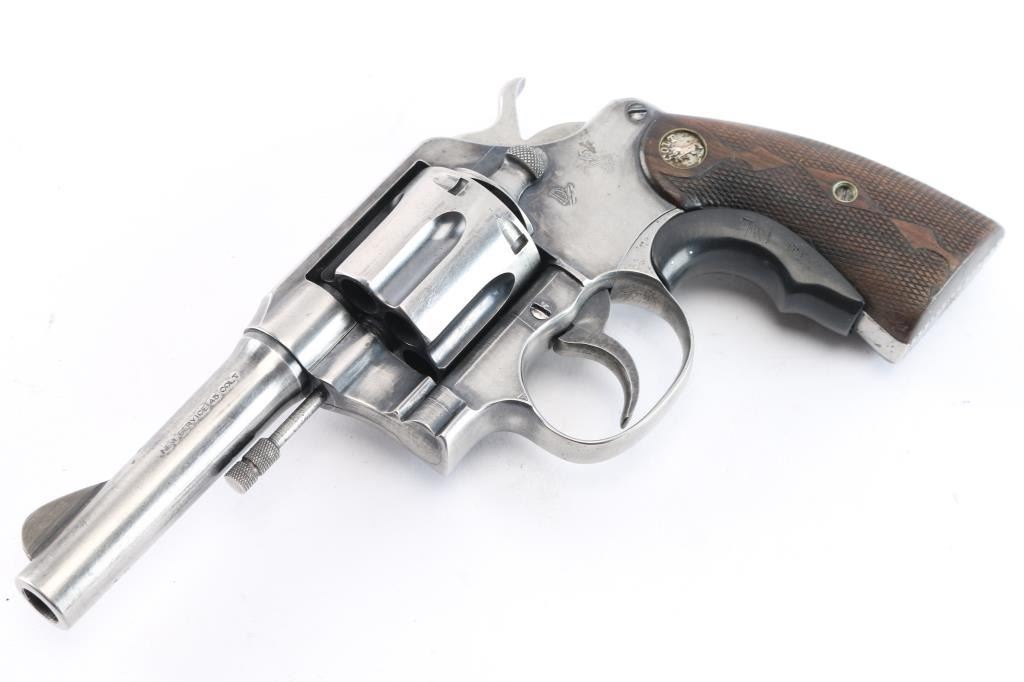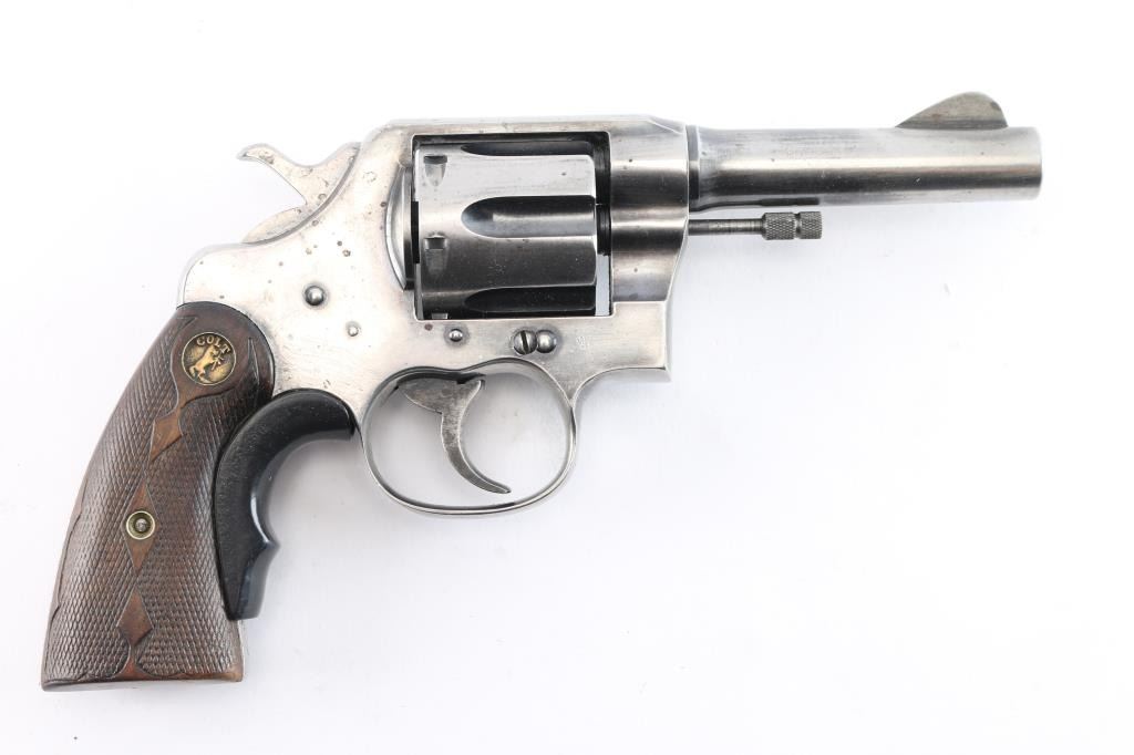 Vintage large frame double action revolver chambered in .45 Long Colt, manufactured circa 1929. It features a shortened 4 1/4" barrel, blade front sight (not original), frame notched rear sight, non-shrouded ejector rod, fluted six-shot cylinder, smooth curved trigger, checkered hammer spur, large square butt frame, Tyler T grip, and two-piece checkered/diamond hardwood grips with Colt medallions. The hole for the lanyard ring has been filled, and the bottom of the grip is serrated. Revolver retains almost none of its original finish because it has been 'cleaned.' The action is smooth with solid lock-up, and the bore is bright with strong rifling. There is a marking on the left side of the frame that appears to be a 'D' with a slash. The wood grips are very good with a few handling marks.