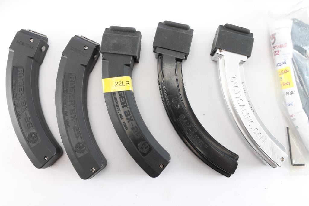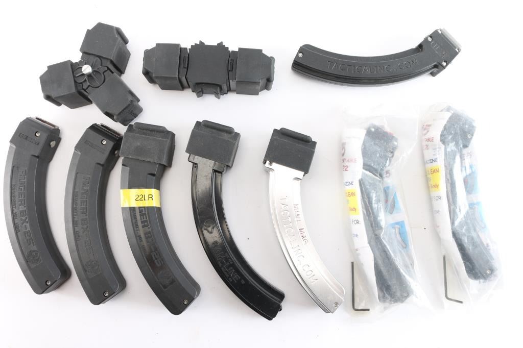 Lot Includes three Ruger BX-25 magazines, one Ram-Line 25 rd magazine, three Tacticalinc.com TI-25 magazines, two in packaging, one Tacticalinc.com TI25 aluminum Magazine, Tri Mag with thee Ruger 10 rd magazines installed and E&L Quad Clip with two Ruger 10 rd magazines installed. Eight of the magazines have Christie's rubber caps on them. All in very good-excellent condition.