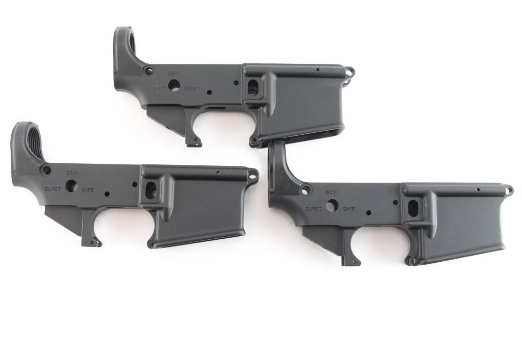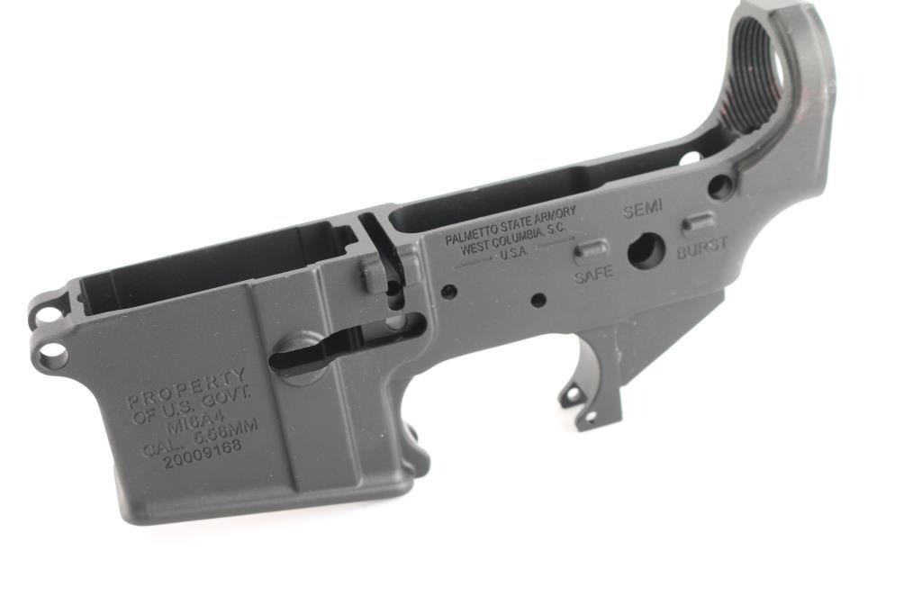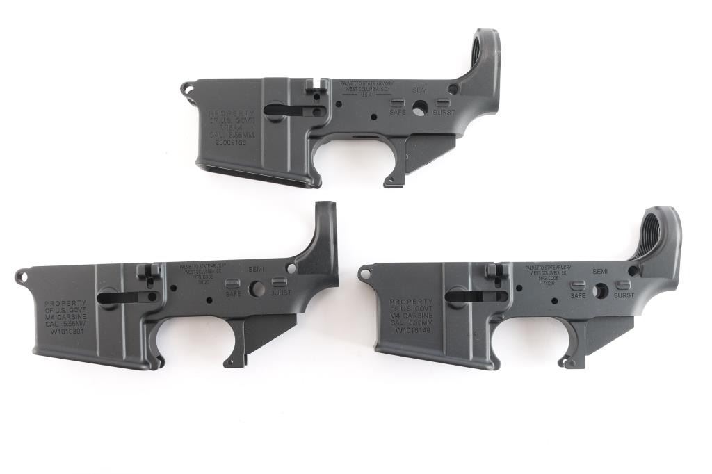 American made limited-edition lowers using the advanced aerospace manufacturing technology to produce 7075-T6 forged aluminum Mil-Spec lower receivers. Manufactured in West Columbia, SC. These receivers are marked '5.56mm' with 'PROPERTY OF U.S. GOVERNMENT.' The finish is black hard coat anodized per Mil-8625 Type 3 class 2. These receivers are stripped with no parts in them. 1) PSA, M4 Carbine, 20009168, has a retained finish of 99% with only superficial scratches. It is marked 'M16A4' above the serial number and has an open trigger guard. It is also marked 'SAFE,' 'SEMI,' and 'BURST.' 2) PSA, M16A4, W1010301, has a retained finish of 99% with only superficial blemishes. It is marked 'M16A4' above the serial number and has an open trigger guard. It is also marked 'SAFE,' 'SEMI,' and 'BURST.' 3) PSA, M4 Carbine, W1016149, has a retained finish of 99% with only superficial blemishes. It is marked 'M4 CARBINE' above the serial number and has an open trigger guard. It is also marked 'SAFE,' 'SEMI,' and 'BURST.' This has some manufacturing finish imperfections on the left side of the receiver.