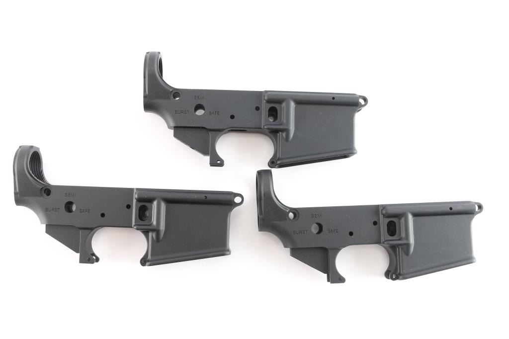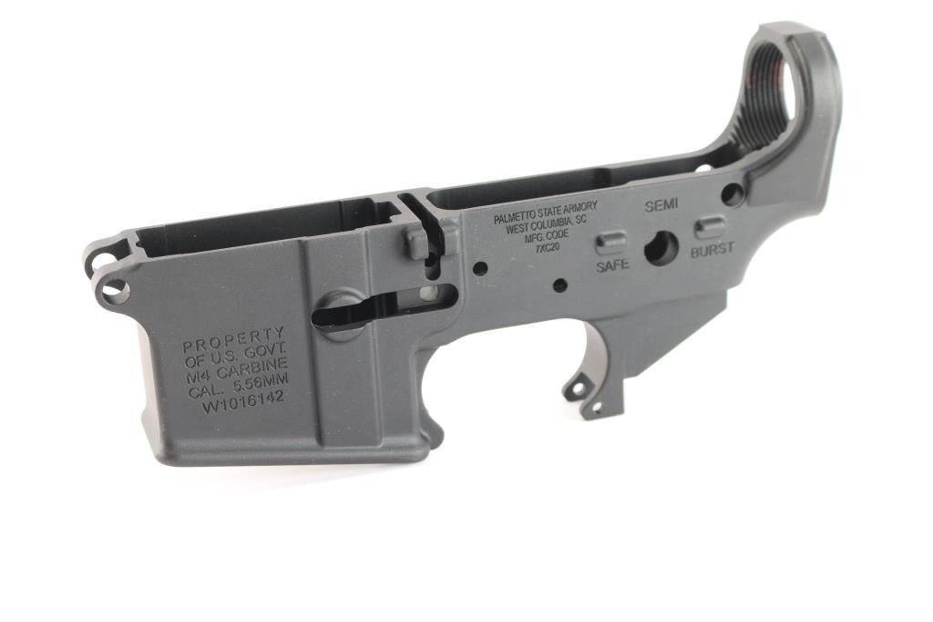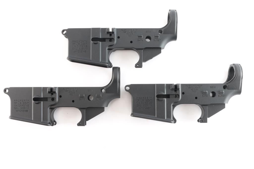 American made limited-edition lowers using the advanced aerospace manufacturing technology to produce 7075-T6 forged aluminum Mil-Spec lower receivers. Manufactured in West Columbia, SC. These receivers are marked '5.56mm' with 'PROPERTY OF U.S. GOVERNMENT.' The finish is black hard coat anodized per Mil-8625 Type 3 class 2. These receivers are stripped with no parts in them. 1) PSA, M4 Carbine, W1015166 has a retained finish of 99% with only superficial blemishes. It is marked 'M4 CARBINE' above the serial number and has an open trigger guard. It is also marked 'SAFE,' 'SEMI,' and 'BURST.' 2) PSA, M4 Carbine, W1014881 has a retained finish of 99% with only superficial blemishes. It is marked 'M4 CARBINE' above the serial number and has an open trigger guard. It is also marked 'SAFE,' 'SEMI,' and 'BURST.' 3) PSA, M4 Carbine, W1016142 has a retained finish of 99% with only superficial blemishes. It is marked 'M4 CARBINE' above the serial number and has an open trigger guard. It is also marked 'SAFE,' 'SEMI,' and 'BURST.'