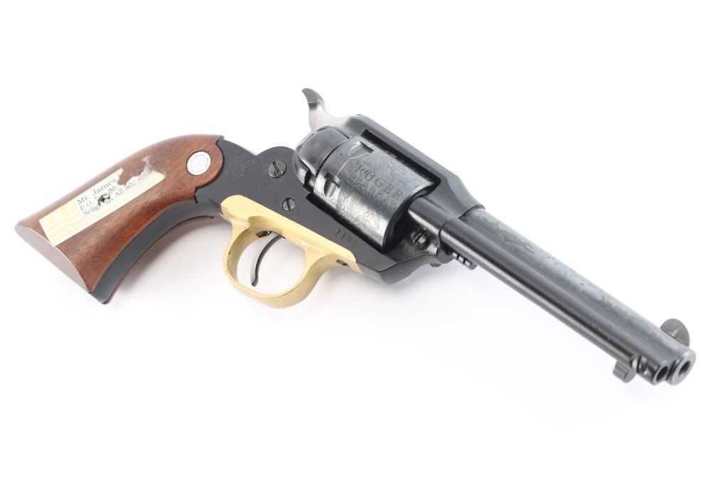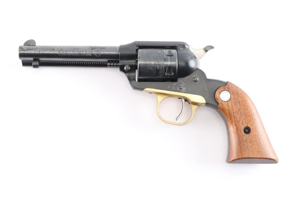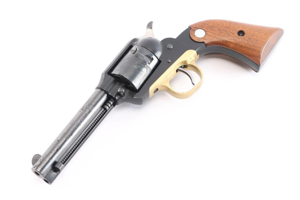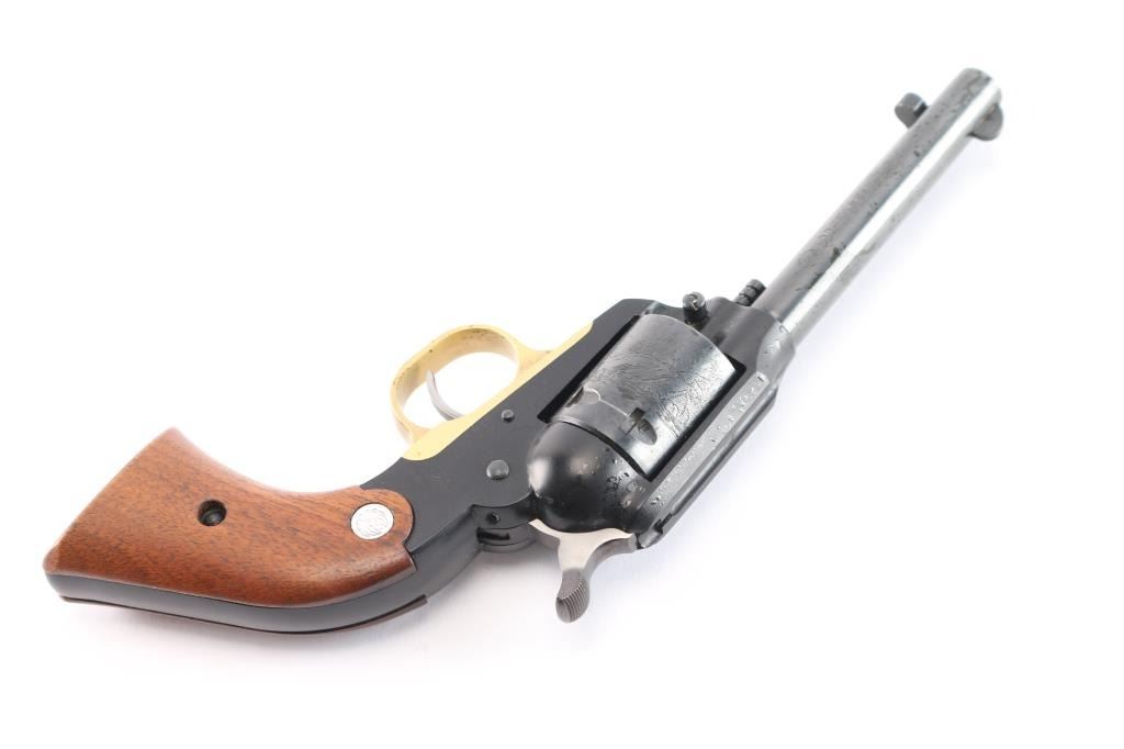 'Old Model’ Small frame single action revolver modeled along the lines of a scaled down Remington 1890 and chambered in .22 Long Rifle. Vintage revolver manufactured in Southport, CT circa 1968. It features a blued 4" barrel, ejector rod with flat faced button, blade front sight, square notched frame rear sight, black anodized alloy frame, unfluted blued six-shot cylinder with roll-stamped bear & cat scene, brass color anodized alloy trigger guard, smooth curved thin trigger, serrated hammer spur, and two-piece smooth walnut grips with Ruger medallions. Revolver retains approximately 98% of its original finish showing some very minor scratches and nicks. Action is crisp with very good lock-up, the bore is excellent, and the walnut grips are excellent minus an address sticker stuck on the right grip panel. This firearm is covered with dried oil, or CLP from storage.