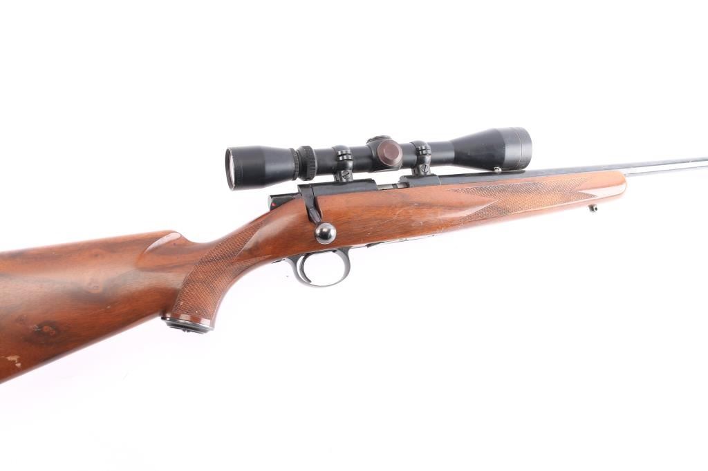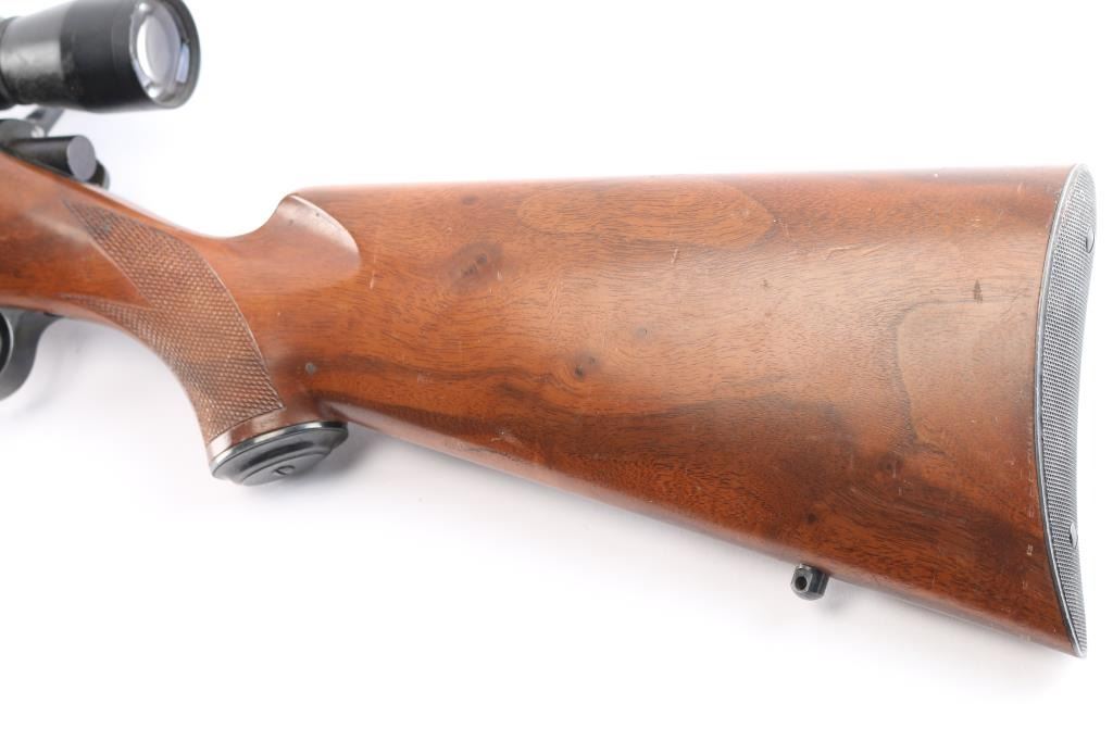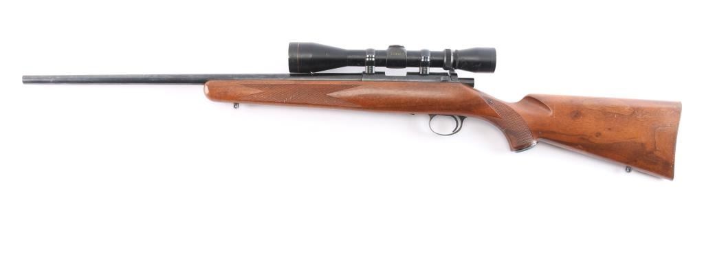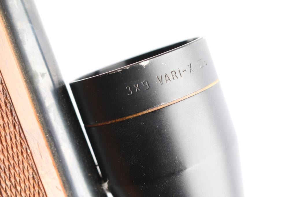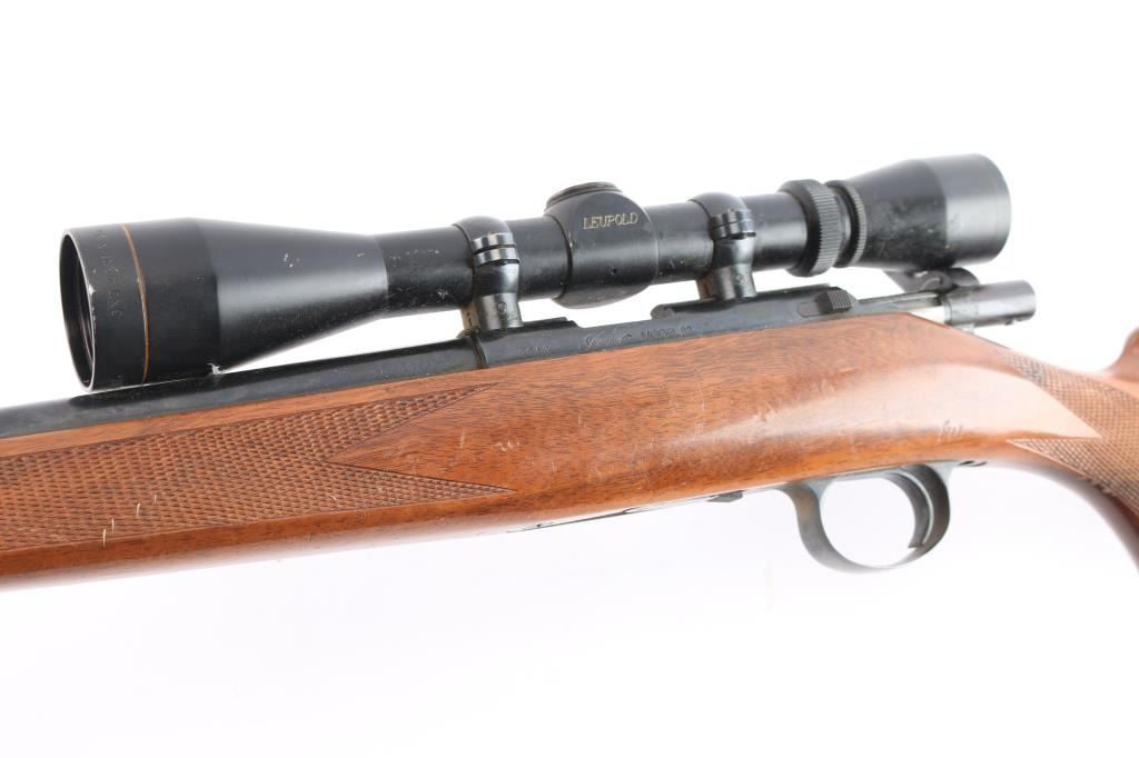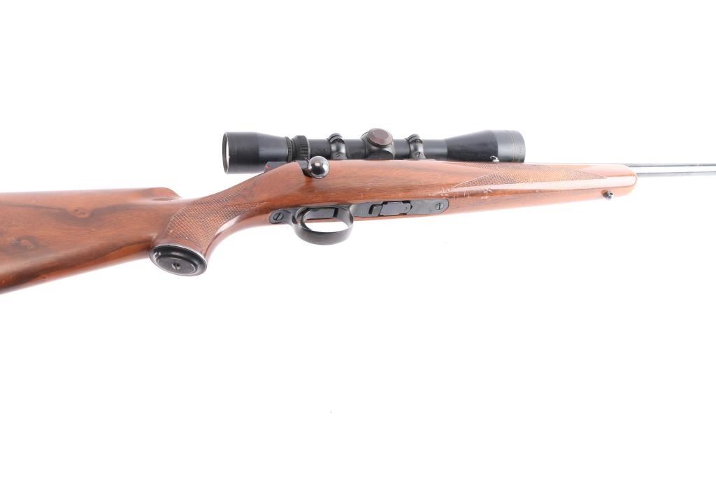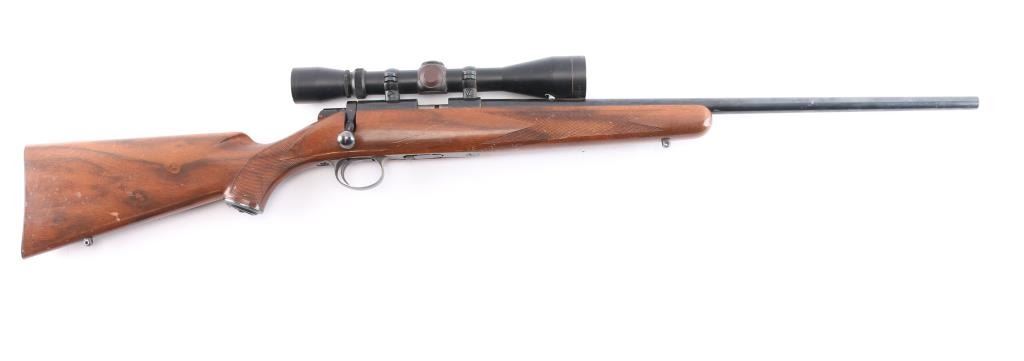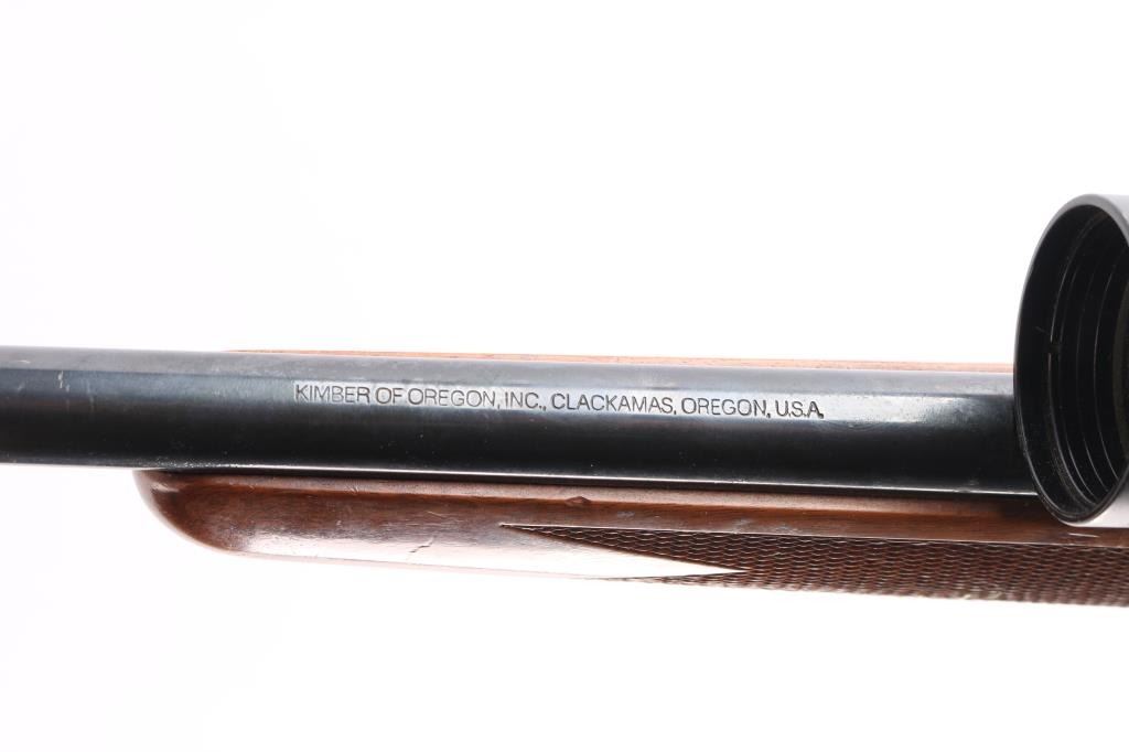 Kimber bolt action rimfire rifle chambered in .22 LR manufactured in Clackamas, OR. It features a blued finish, walnut stock, checkered forend, checkered semi-pistol grip, checkered steel buttplate, contoured steel grip cap, 22" barrel, no sights, dovetailed grooved receiver, smooth curved trigger, detachable 5 rd magazine, external bolt stop on left side of receiver, manual safety, and sling studs. The direct mount rings are fitted with a Leupold 3-9x, Vari-X II scope with a duplex reticle, and the optics are clear. Bore is dirty, but there appears to be good rifling. The rifle retains 95% finish, with muzzle edge wear, and a couple of blemishes on the barrel. This gun was stored with an oil, or CLP which dried but should clean off. The stock is in good condition with handling marks and a few minor blemishes.