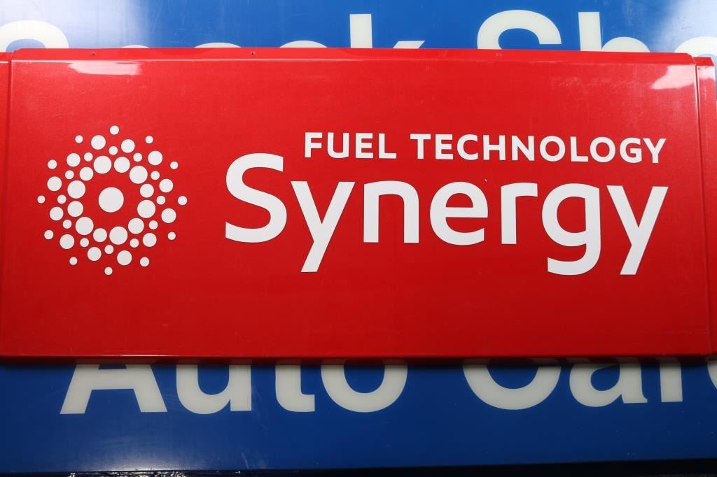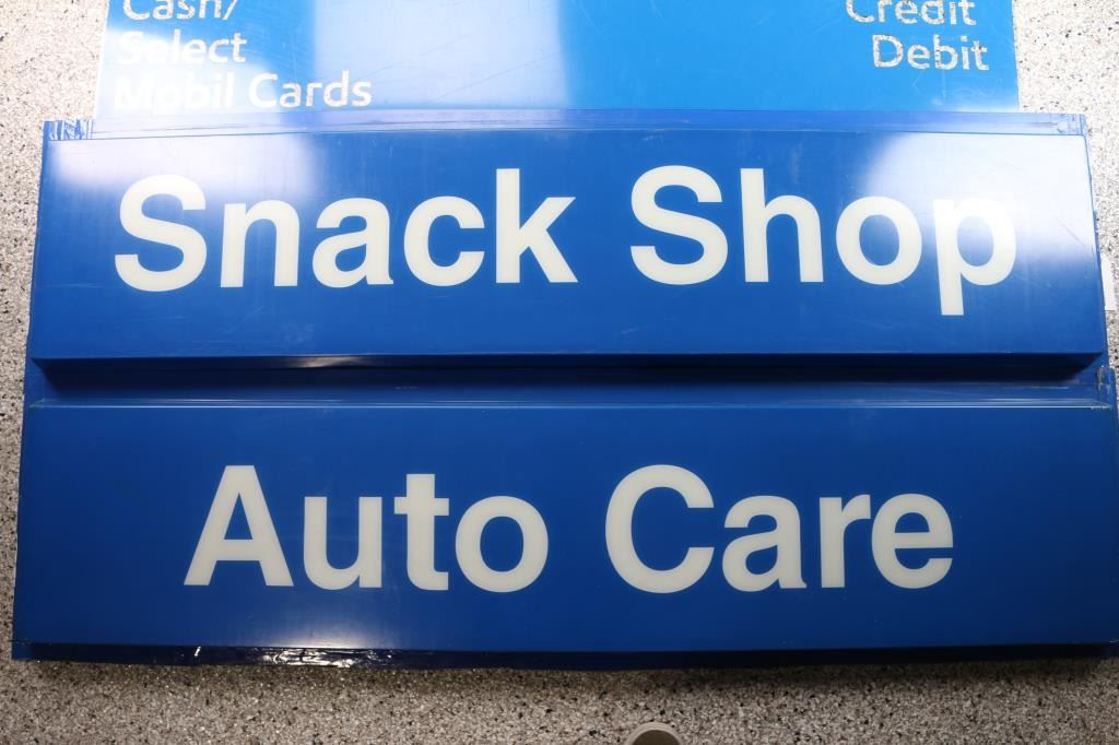 From Chevron Gas station. Includes: two - 56 1/2"L X 12"W X 2 1/2"D white writing on & blue background acrylic signs of " Snack Shop' & "Auto Care"; two - 53"L X 14"W clear writing on blue background, "Gasoline" signs; one - 39 1/4"L X 17"W white on red background, "Synergy" and three 16 1/2"L X 6 3/4"W clear writing on blue background signs. Some with scattered scratches, scuffing. All in fair to good condition.