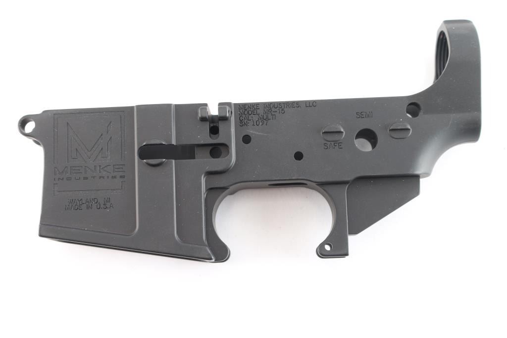 The American made MR-15 is an AR-15 type receiver constructed of 6061-T6 aircraft grade aluminum that is finished with the proper Mil-8625 Type III class 2, hard-coat anodizing. Manufactured in Wayland, MI. The MR-15 is a billet receiver that sports a traditional open trigger guard allowing for your choice of trigger guard. They are marked with the Menke trademark, and are also marked 'SAFE' and 'SEMI' around the selector. 1) Menke, MR-15, #1097 Receiver is marked 'Multi.' 2) Menke, MR-15, #1119 Receiver is marked 'Multi.' The original matte black anodizing retained is approximately 99% (on both) with nothing remarkable.
