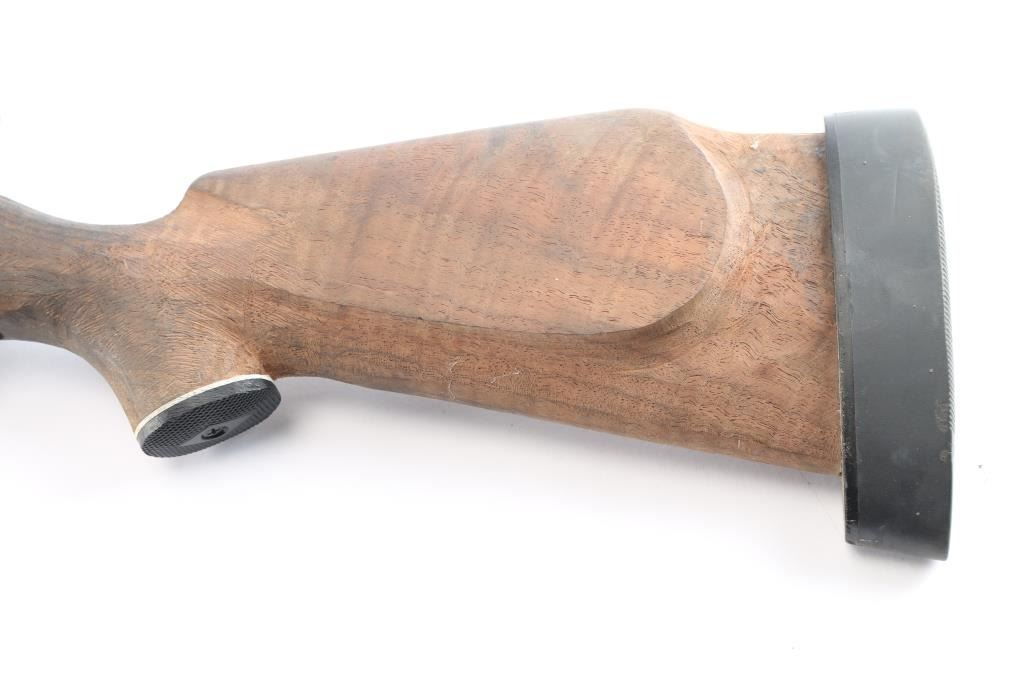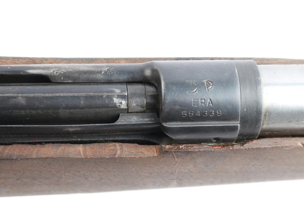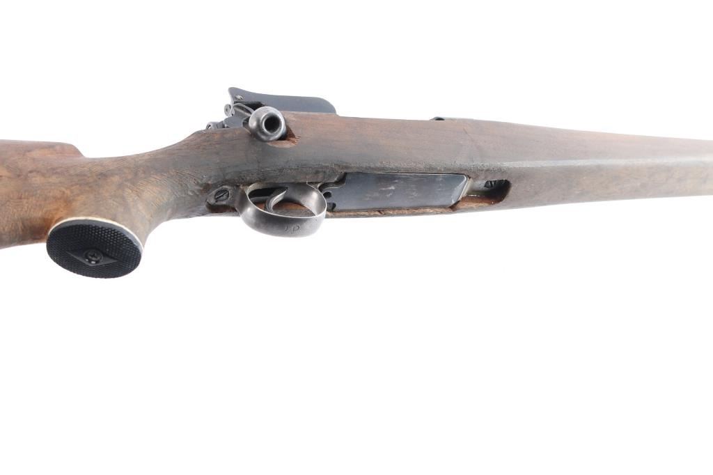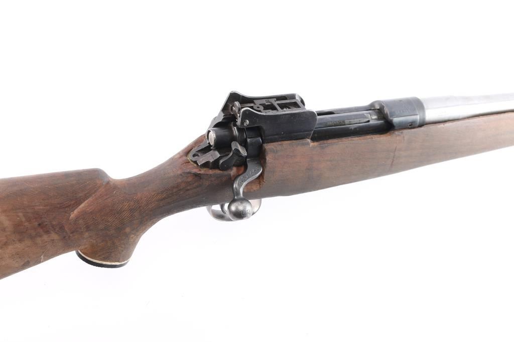 This is a highly sporterized British bolt action rifle which was a 'drill purpose' rifle before it was sporterized. Originally manufactured in Eddystone, Pennsylvania by Remington Arms for use during WWI. This rifle was re-chambered in .338 Winchester Magnum. It features an approximately 24.5" in-the-white tapered barrel with a recessed crown, a dog-leg style bolt handle, a serrated curved trigger, manual safety, stripper clip guides in receiver, protected blade front sight, folding ladder rear sight with peep apertures, and a hinged floorplate. It has a Monte Carlo style stock that is a work in progress and is serviceable, it has an oversized rubber buttpad, and a checkered grip cap for the semi-pistol grip. The bore looks dark, or dirty, but the rifling looks strong. The original bluing (receiver, trigger guard and floorplate) is approximately 85% because the trigger guard is mostly bare. There is scattered light rust on the barrel. The action seems to be sound.