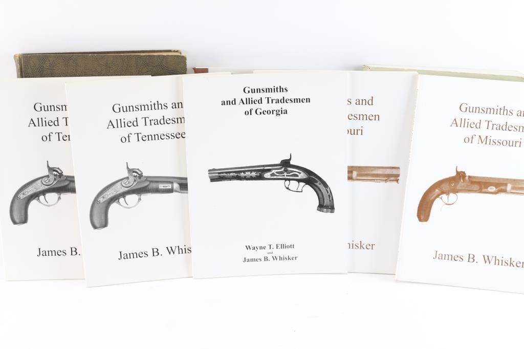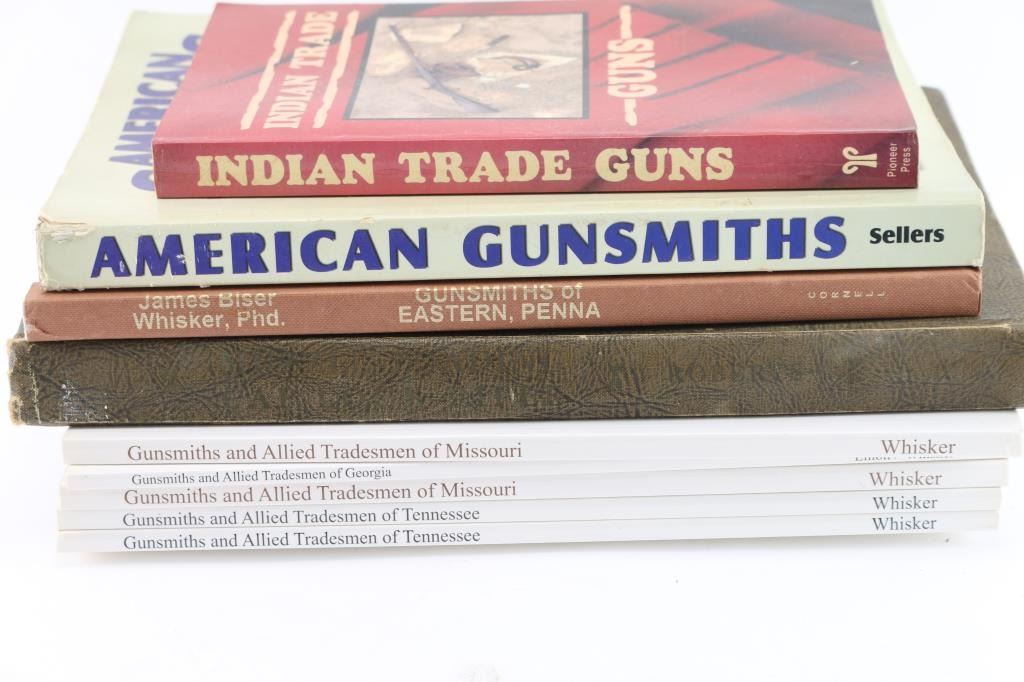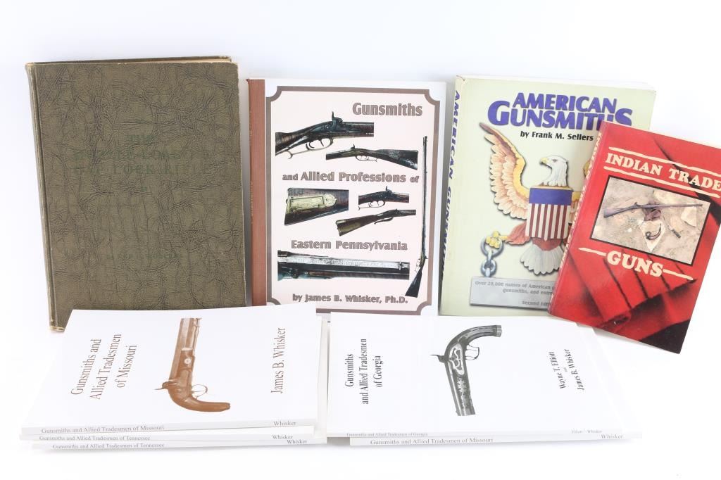 Includes: Indian Trade Guns by Caldwell & other authors; American Gunsmiths by Frank M. Sellers; multiple copies of Gunsmiths and Allied Tradesmen of Missouri, Tennessee and Georgia by James B. Whisker; Gunsmiths and Allied Professions of Eastern Pennsylvania by Whisker and The Muzzle Loading Cap Lock Rifle by Ned H. Roberts.