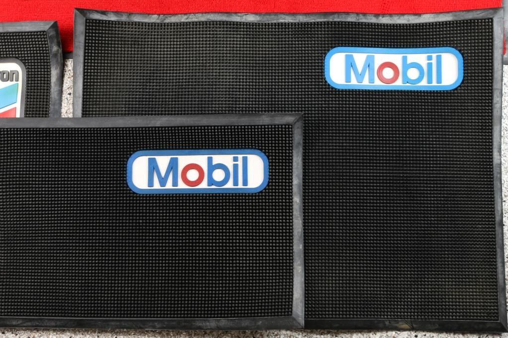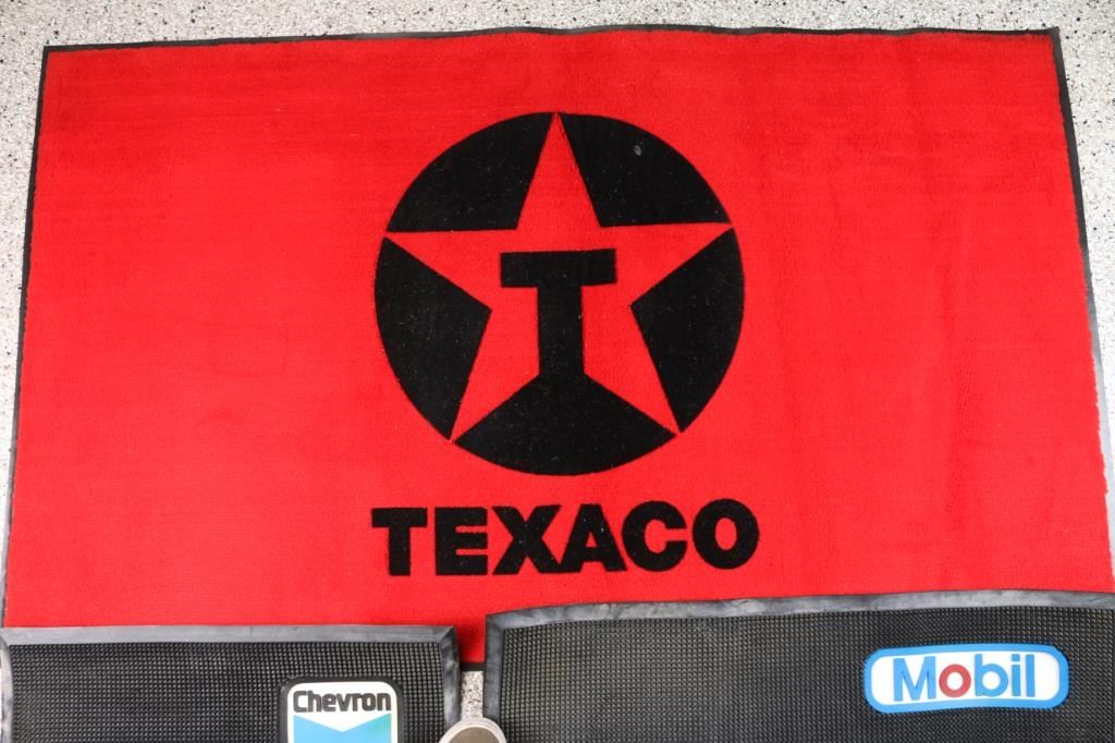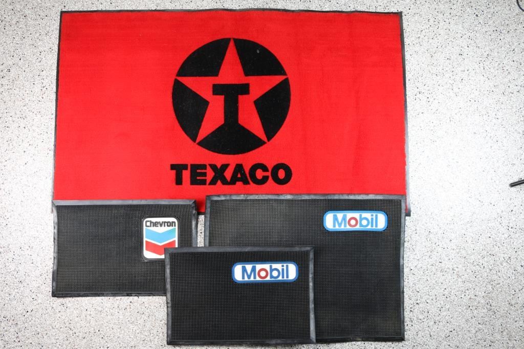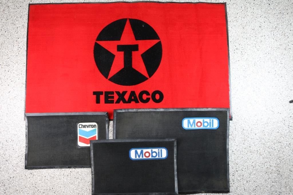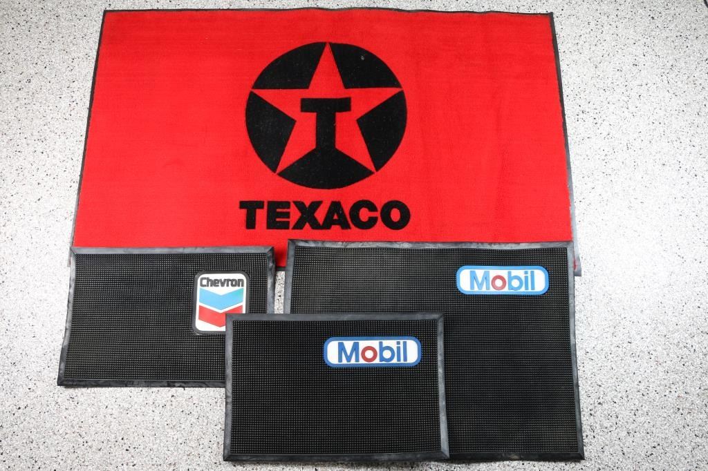 includes: 1 - 'Texaco' Red and Black rug on heavy rubber, 60" X 36", very good condition; 1 - 'Mobile' heavy rubber mat, 34 1/2" X 24", very good condition and 2 - heavy rubber mats, one 'Mobile' and one 'Chevron', both 24" X 16", very good condition.