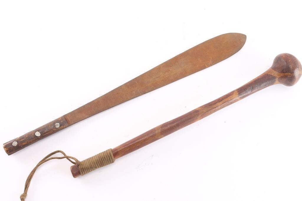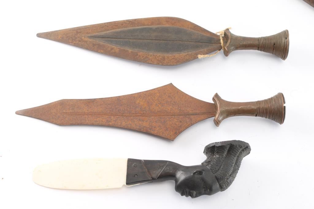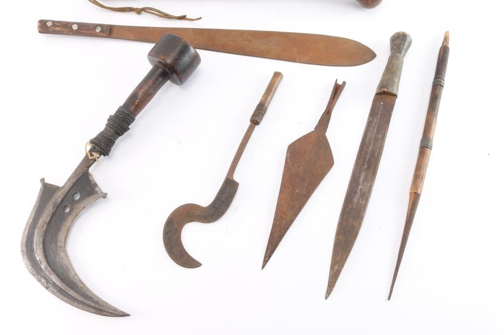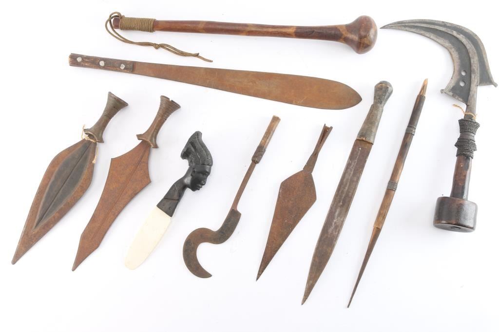 Includes a large curved blade ceremonial knife with wood handle, wire-wrapped; an all wooden skull crusher; spear tip; 3 pole arm blades; a large wood handled machete; a gutting hook; leather wrapped wood handled blade; and wooden carved African head knife with bone blade.