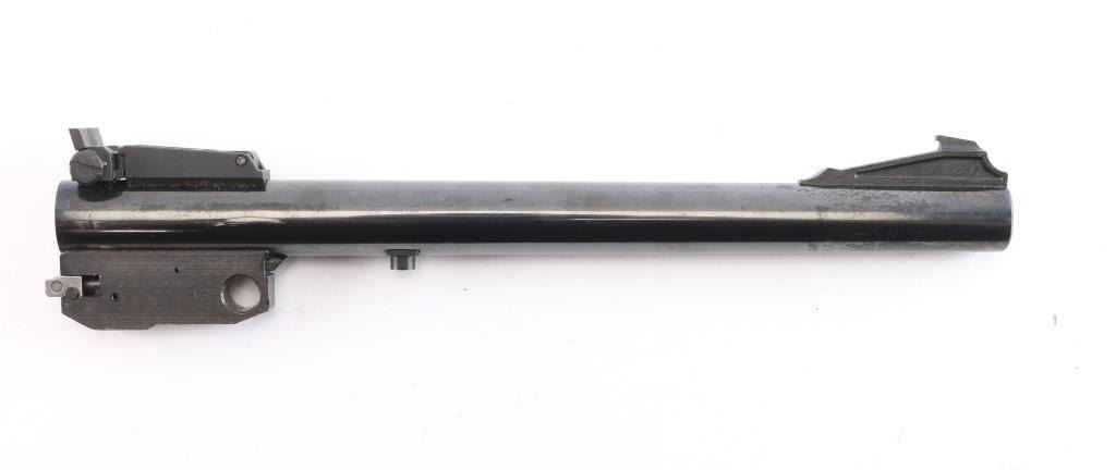 Thompson Contender barrel chambered in .22 Long Rifle. This is a 10" blued barrel with a serrated ramped front sight, and a fully adjustable square notch rear sight. The bore is dirty but appears bright with strong rifling. The blued finish is very good with approximately 98% remaining showing extremely light muzzle edge wear, superficial scratches, and some losses where the action rubs.