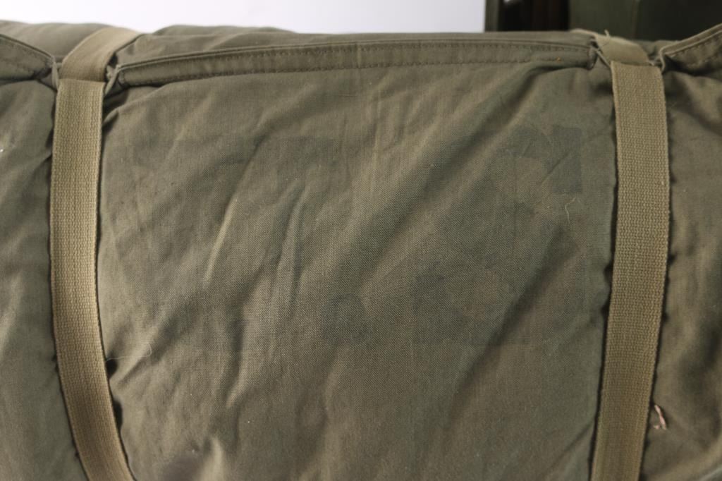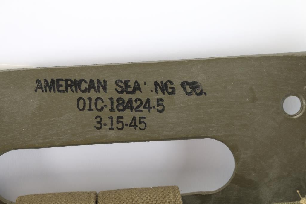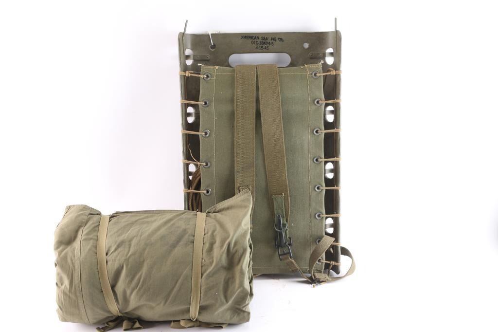 Vintage WWII US Army OD plywood and canvas pack board (pack frame), commonly dated 1944-1945, C-18424-5. Used to carry a radio pack and other field gear such as artillery rounds, ammo boxes, etc. It comes with multiple metal holes for the rope on the sides plus several openings on the back which gave the soldier many ways to attach different items. The upper section of the pack is ink stamped with the manufacturer’s maker "American Seating Co. 01C-18424-5" and dated 3-15-45. reverse embossed with "U.S." Unissued condition, complete with canvas shoulder straps, two metal shelves, spare rope and the original instructions. Also comes with complete U.S. Army Olive drab, canvas bed roll stamped "U.S. with both liners. Both items in excellent condition