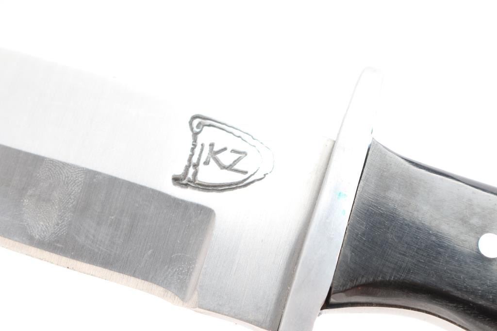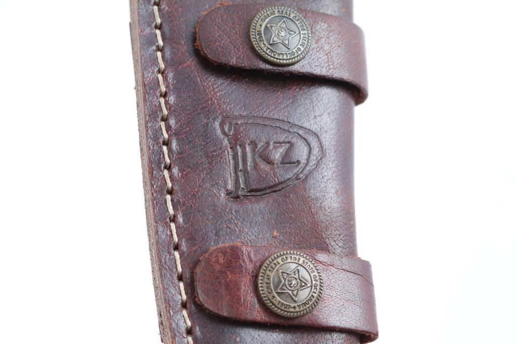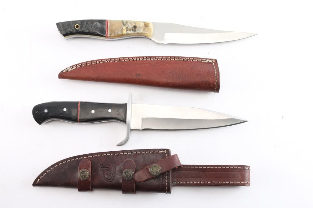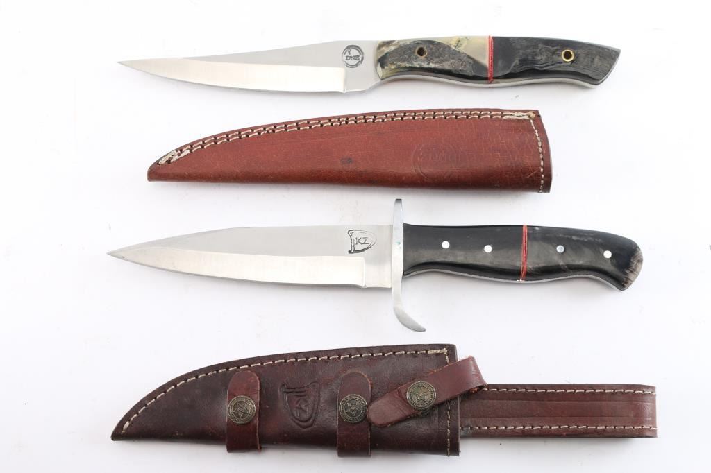 Includes: (1) Fixed blade knife w/ blade measuring 5.25", 11.25" overall. Maker marked "DNZ" w/ antler handle and leather sheath marked "DNZ". (1) Fixed blade knife w/ blade measuring 5.625", 11.5" overall. Maker marked "DNZ" with dark micarta handle and leather sheath with 3 straps. Snaps have 5-pointed star that reads "Great Seal of The State of Oklahoma - 1907".