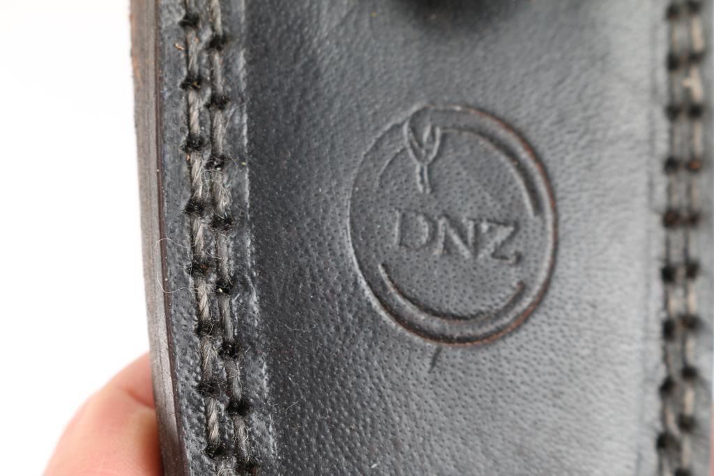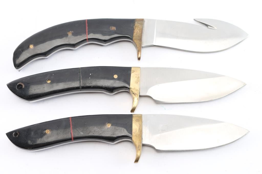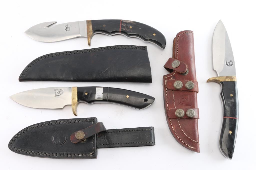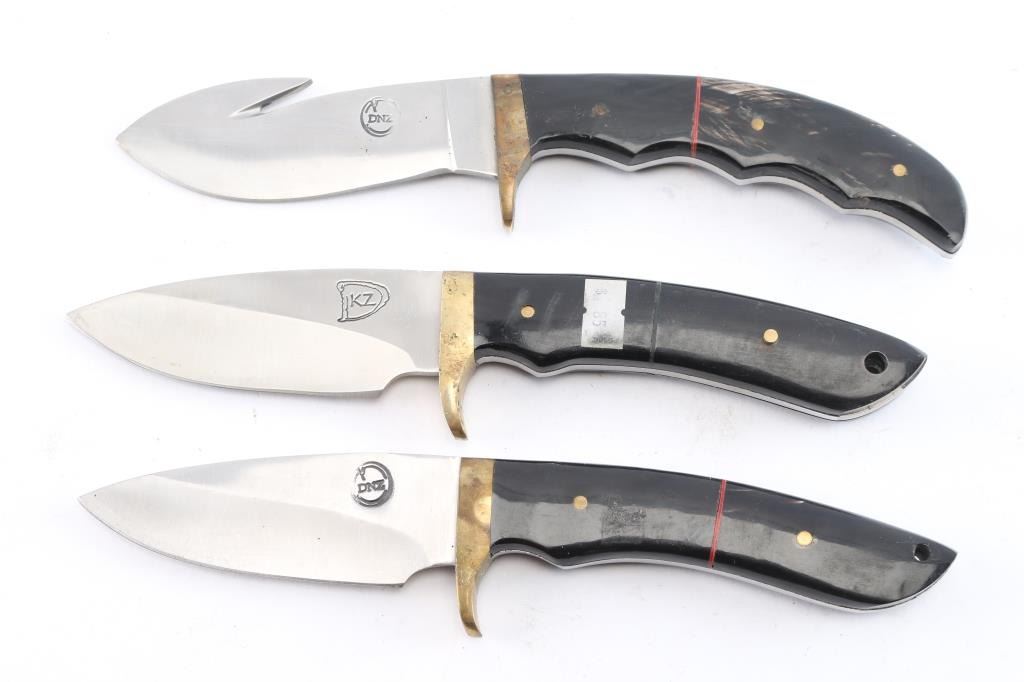 Includes: (1) Fixed blade knife w/ blade measuring 3.75", 10" overall. "DNZ" marked on blade, brass guard and dark micarta handle w/ 2 brass rivets and leather sheath with 3 straps. (1) Fixed blade skinning knife w/ blade measuring 4", 10.25" overall. "DNZ" marked blade w/ brass guard and dark micarta handle w/ 3 rivets and leather sheath. (1) Fixed blade knife w/ blade measuring 4", 10" overall. "DNZ" marked blade w/ dark micarta handle with 2 brass rivets and brass guard and leather sheath.