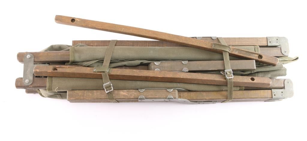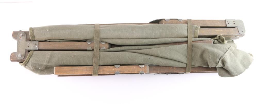 Original U.S. Army WWII and Korean War M-1938 Folding olive drab Canvas and Wood Cot. Very good functional condition. The Canvas is marked EMPORIA MFG CO. March 1945 and the framer is marked but can't make it out.