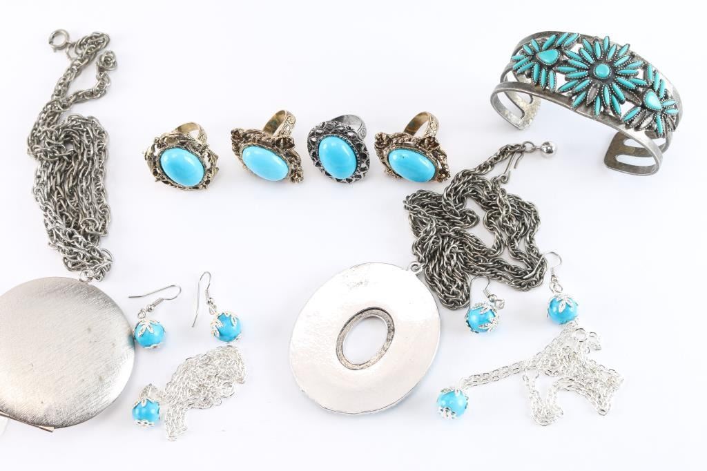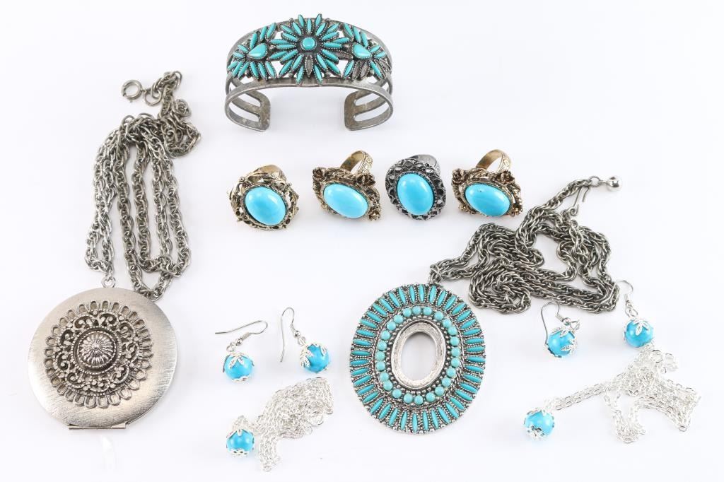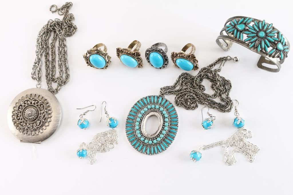 4 Rings, Pair of earrings with matching necklaces, cuff bracelet faux turquoise, and two pendants on chains faux turquoise pendants.