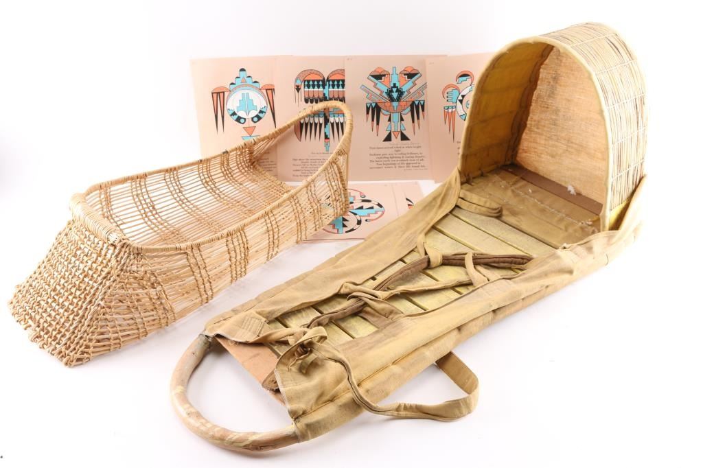 One single rod cradle board wrapped in yellow fabric and one other wicker basket. Largest measures 35" x 13" x 12".