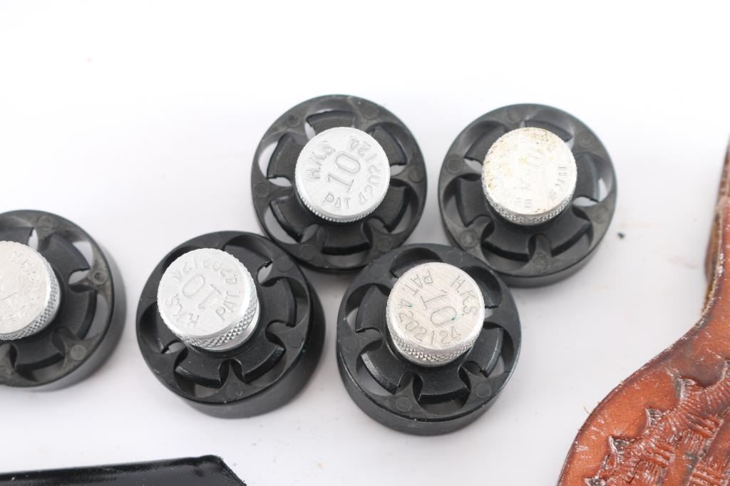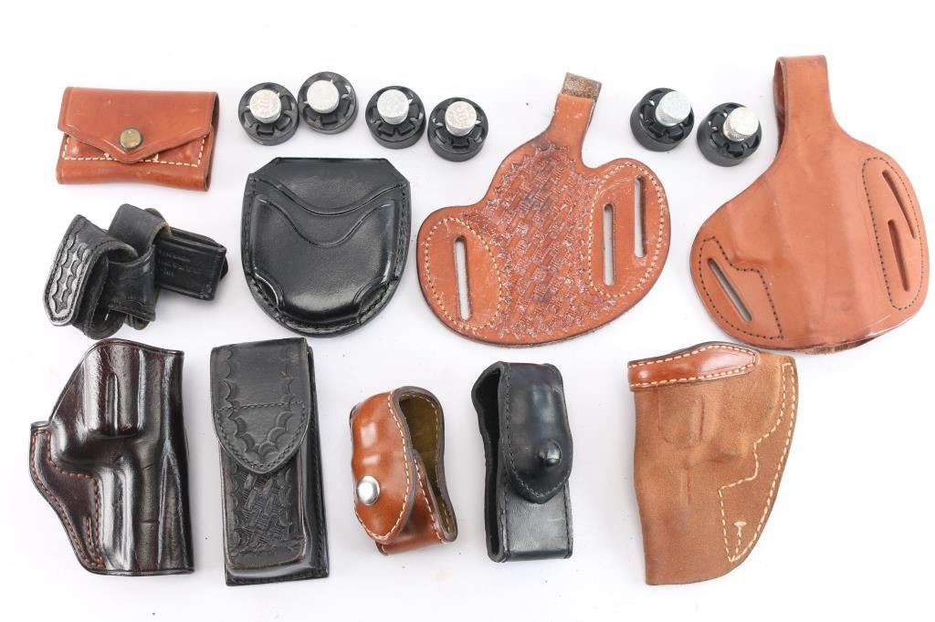 Includes: (1) Strong brown leather 1911 holster, (1) Ross Leather brown leather holster with basket weave tooling, (1) Don Hume handcuff leather holster, (1) Safariland tooled black leather magazine pouch for 9mm, (1) dark brown leather revolver holster, (1) IWB revolver leather holster, (2) Safariland leather speedloader pouches, (4) Safariland tooled black leather keepers, (1) Bucheimer pouch, (6) 6-shot speedloaders.