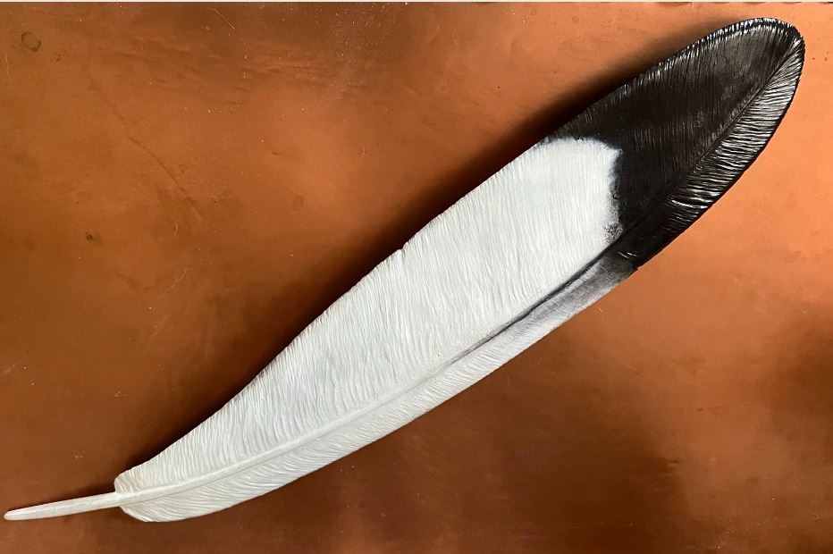 Frank and Sue Entsminger have created a delicate, hyper-realistic artwork perfectly reflecting an eagle wing feather. Capturing a fleeting object permanently in bronze.