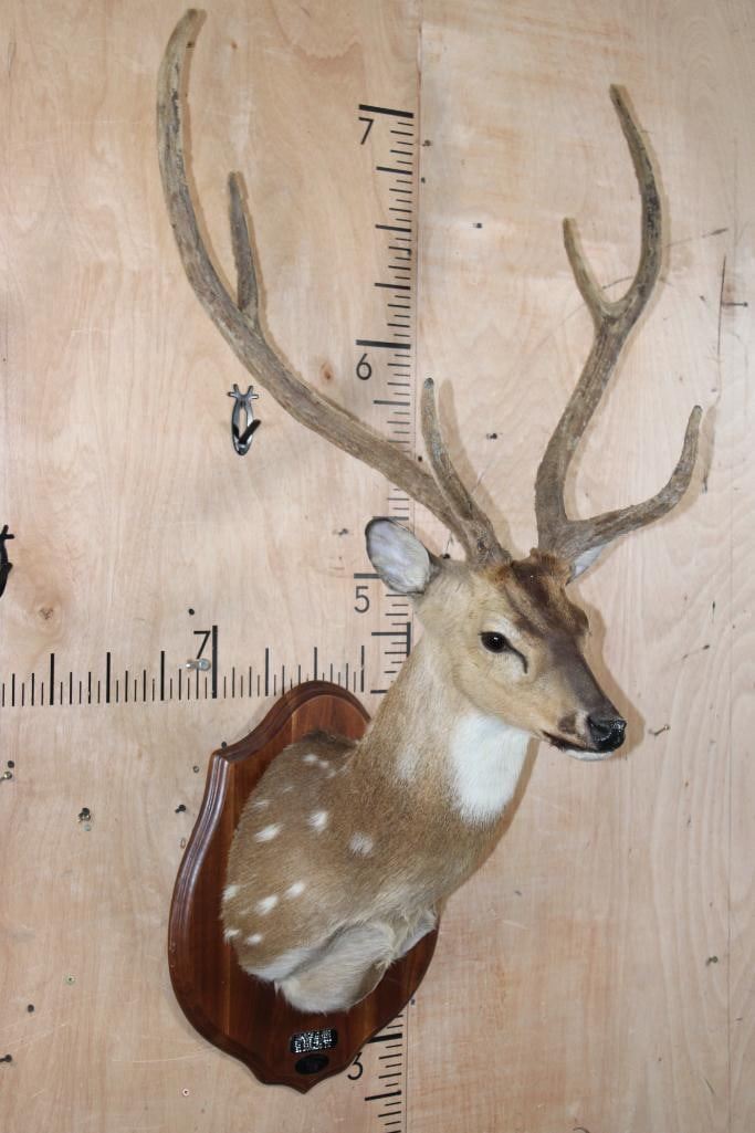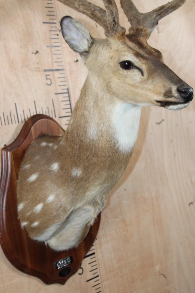 Nice and Clean AXIS DEER Shoulder Mount in Partial Velvet. It has a 28.75" Spread, is mounted on a Wood Plaque, and is in Good Condition. TAXIDERMY