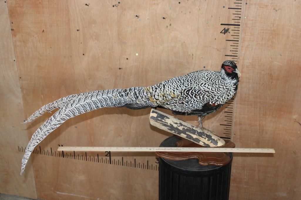 Beautiful and Very Nice, Newer, and Clean Life-sized SILVER REEVE'S PHEASANT. It is standing on 1 foot and signed by the artist "W T, 2016". It is displayed on a branch and nice Wood Plaque. The Total Mount measures 36" Long x 13" Wide x 17" Tall and is in Very Good Condition. TAXIDERMY BIRDS