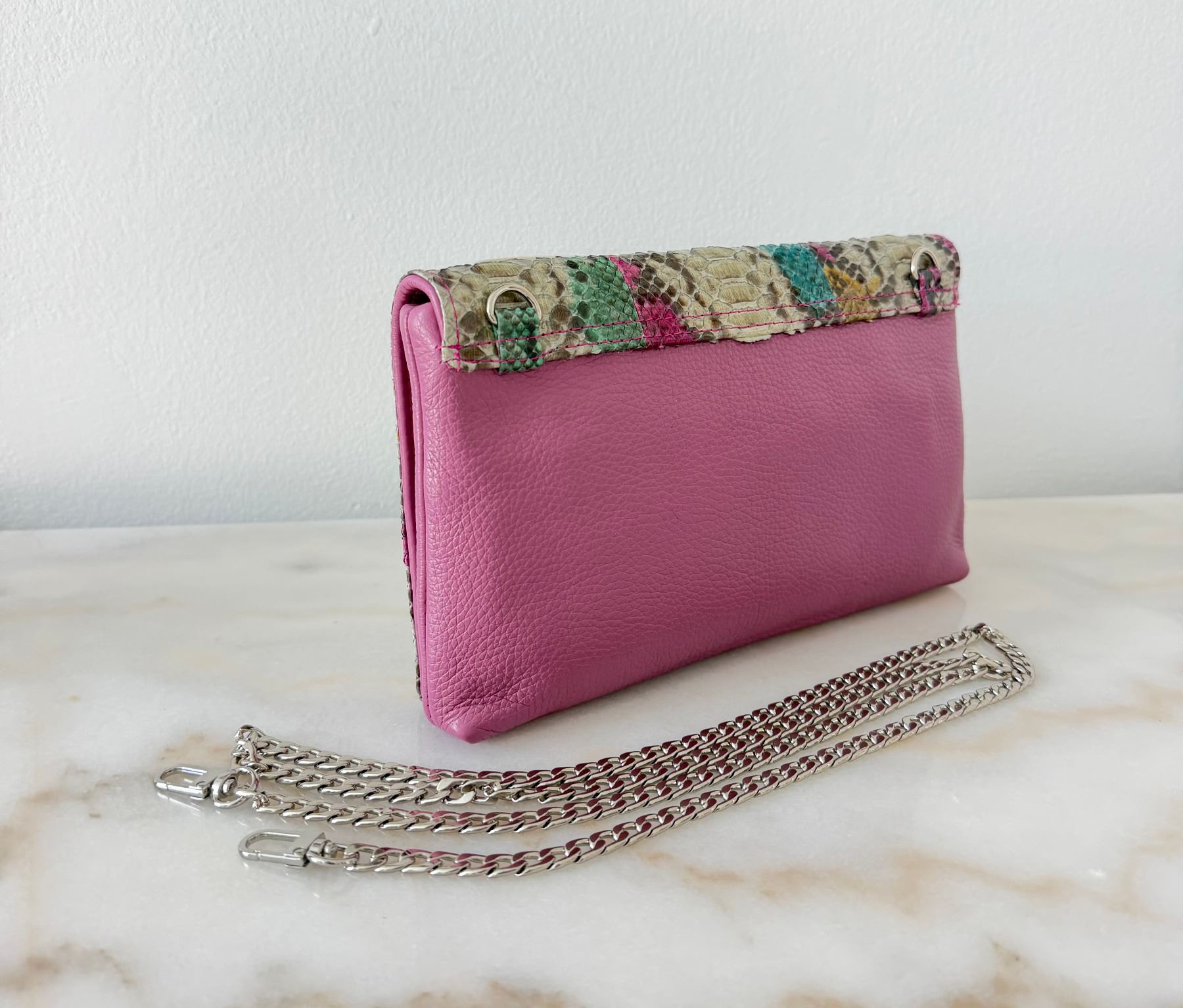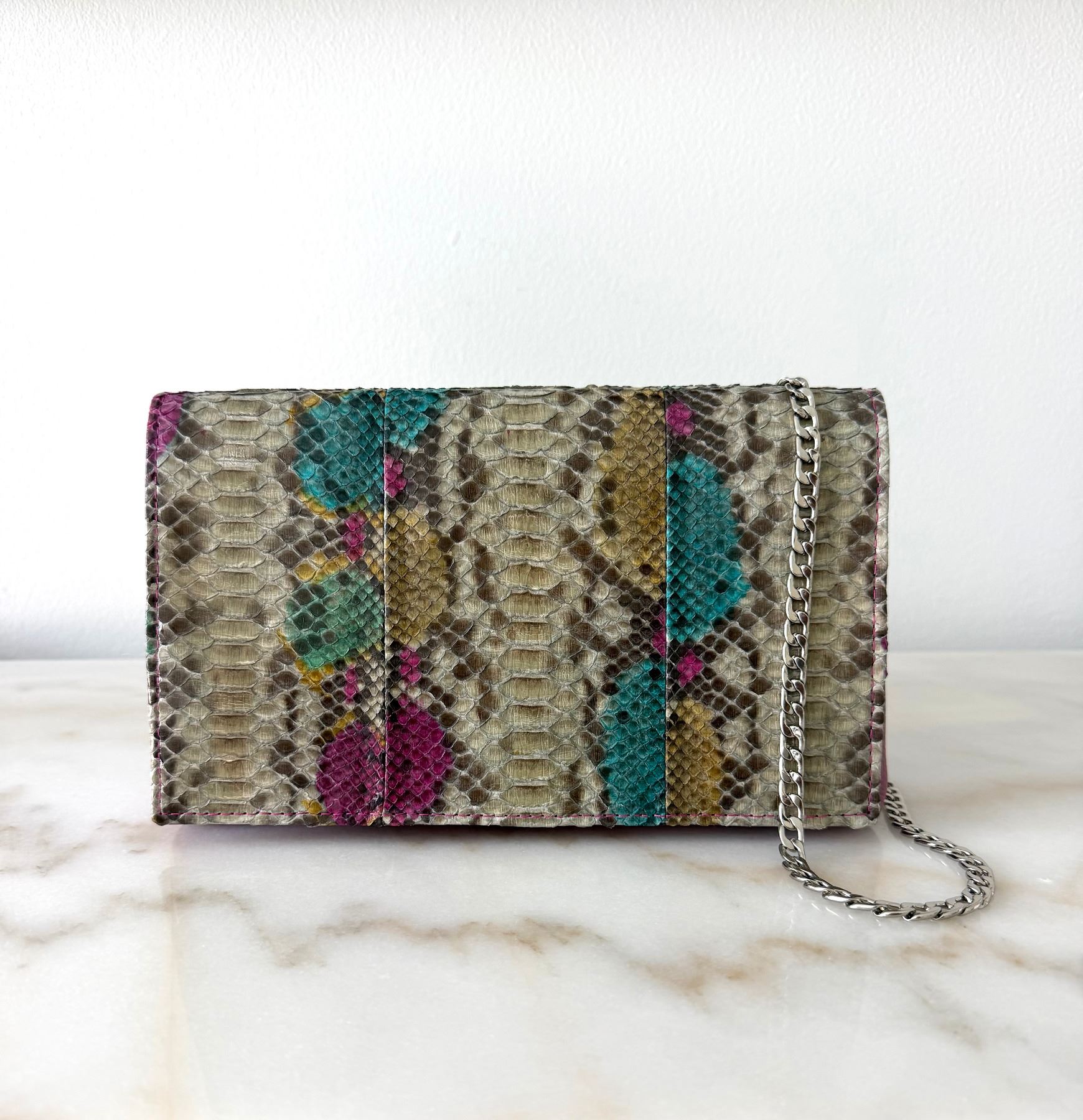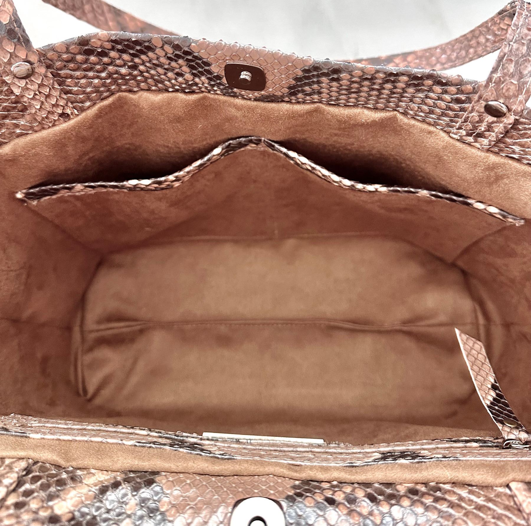 Convertible tote bag, made from genuine python skin with a glazed finish. The skin was tanned in Italy. The colors are neutral: grey, blush, and taupe. The markings of the python show through. Back zipper pocket. Fully lined with several interior compartments. Bottom feet for protection. Lightweight, yet extremely durable and perfect to be handed down for generations.