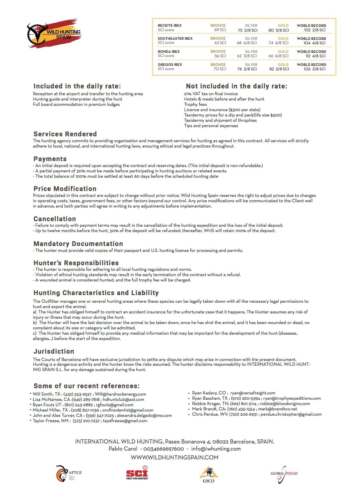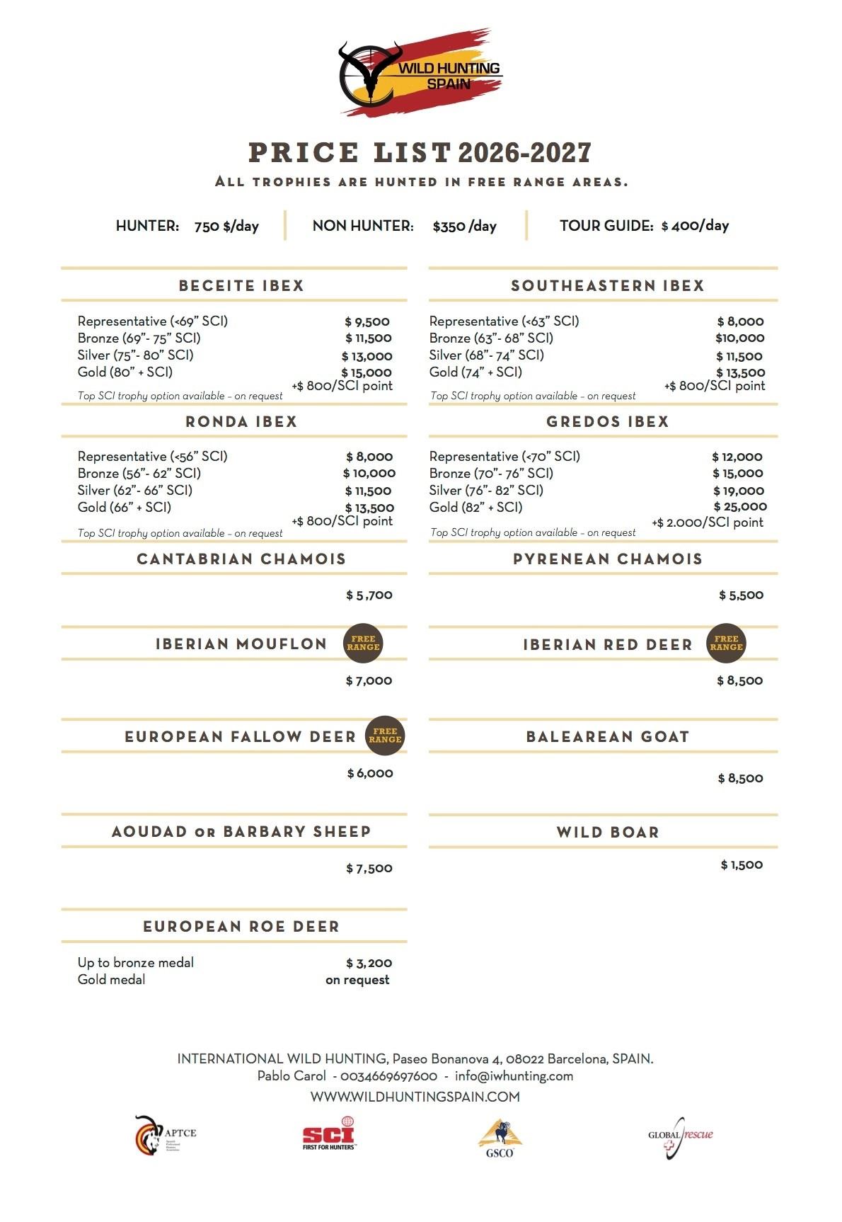 Trophy Fees: Ibex Gredos ($12000) Berceite Ibex ($9000) Southeastern Ibex ($8000) and