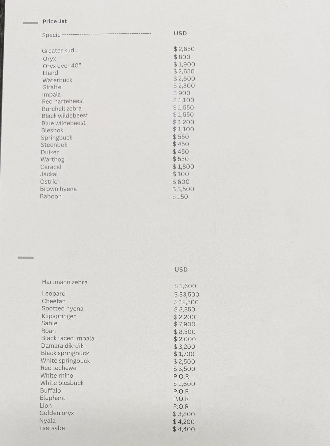 Trophies: (To be share by the hunters)2-Oryx Trophy Fees Included. 1-Warthog Trophy Fee Included.