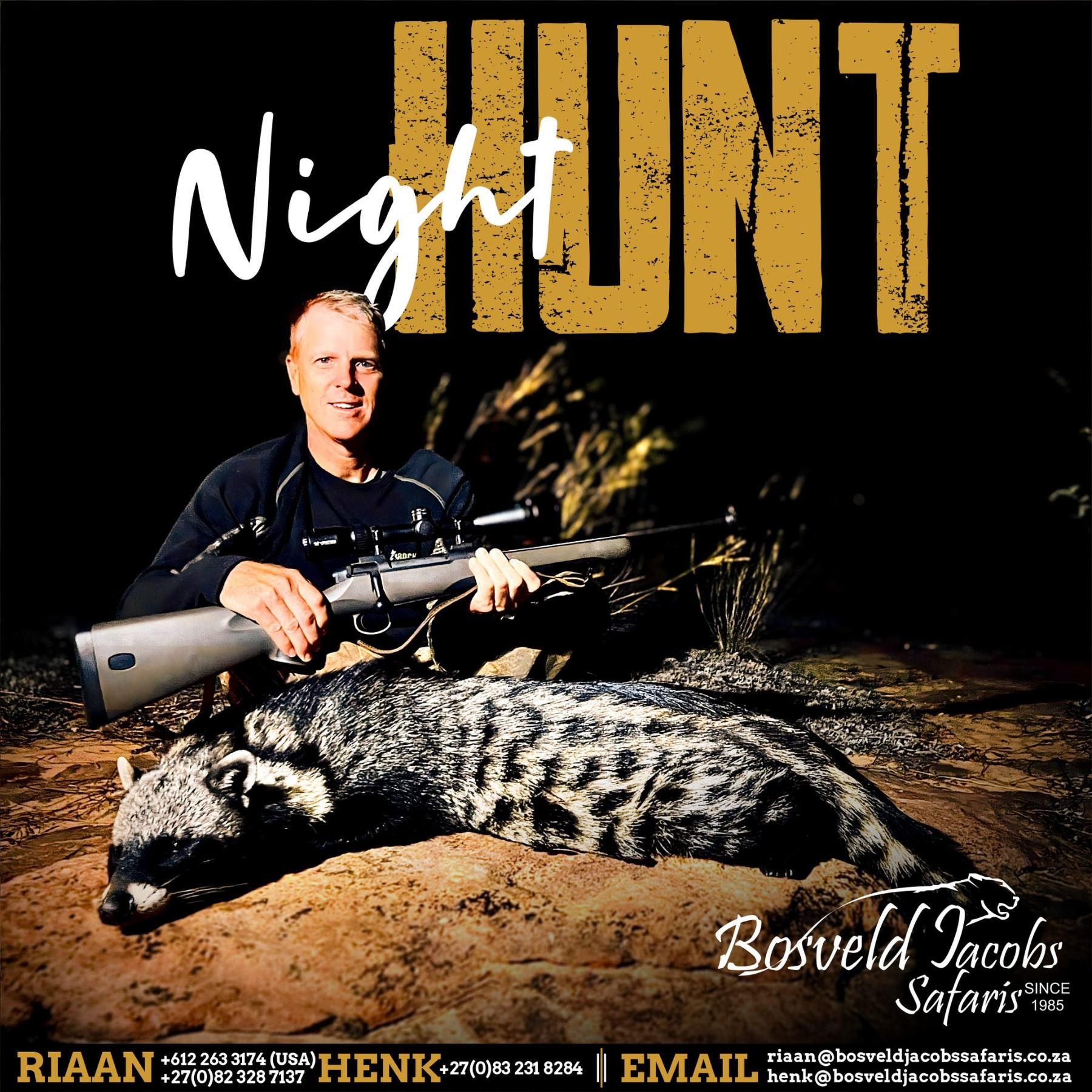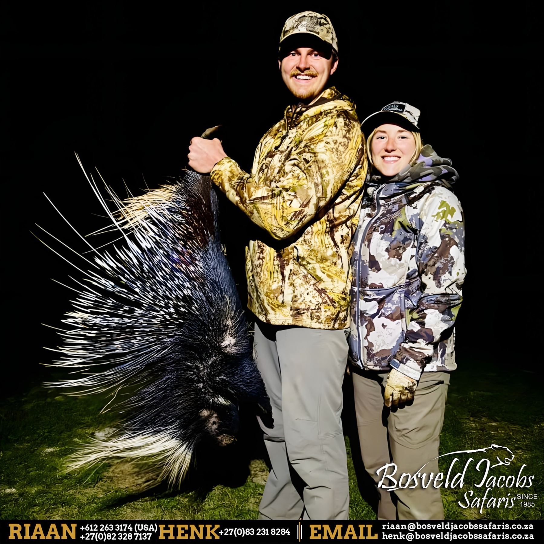 This hunt combines modern technology, predator management, and heart-pounding excitement in one unforgettable package. Included species are (1) Civet, (1) Honey Badger, (1) Genet, (1) Brown Hyena (not exportable), (1) Bushpig, (1) Porcupine, (1) Caracal, and unlimited Jackals. After each exhilarating night hunt, return to Bosveld Jacobs’ beautiful new lodge to relax, recharge, and prepare for the next evening’s adventure. This is a rare opportunity to enjoy a truly unique African safari experience few hunters will ever forget.