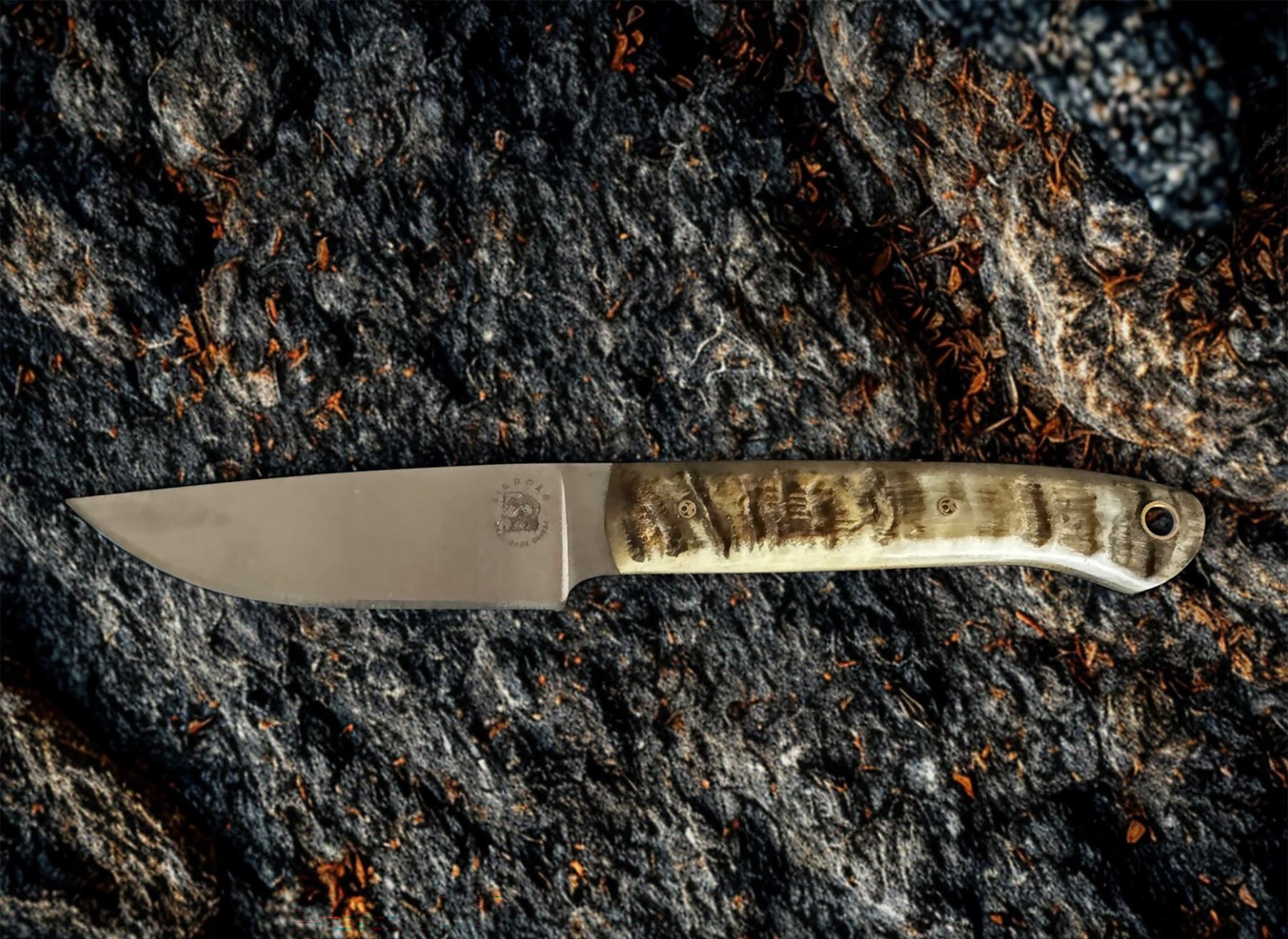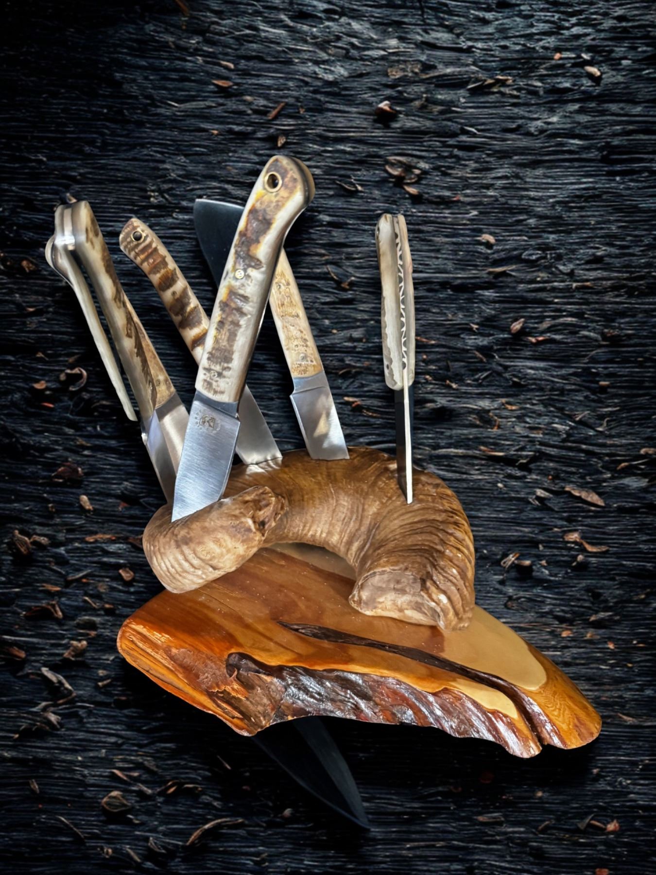 6 piece Sheep Horn Steak Knife Set with Custom 3d printed Sheep Horn and Juniper Stand.