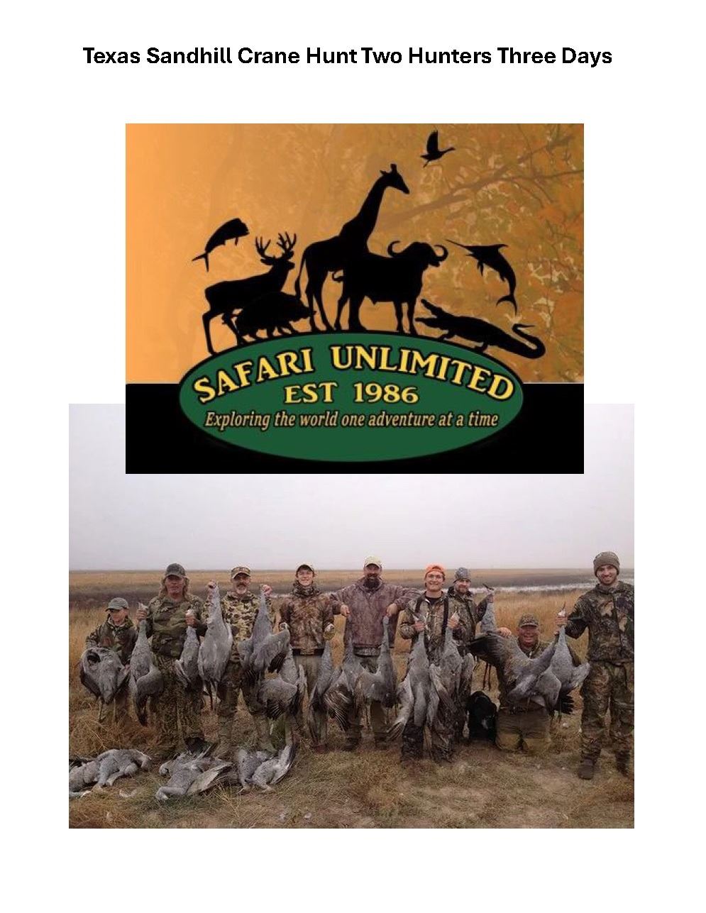 Known as the “Ribeye of the Sky”, this 3 day/3 night hunt will give you the perfect taste of adventure! Come explore thousands of acres of the flatlands of west Texas while you chase the beautiful Sandhill Crane. This package includes lodging and breakfasts at a local hotel and hearty meals and cold drinks served by staff every evening in a beautiful converted barn or we will take you to taste the cuisine at some of our favorite restaurants. The Diamond Wing Outfitters staff and guides will give you a fun-filled trip while you enjoy gorgeous sunrises and good company! Each evening, your guide will provide you with the pin location of where the next day's hunt will be after they have scouted the best location to take our chances with this migratory species. Near or Far we can drive up to an hour away to find the biggest group of cranes possible, but the spread will be set and ready for you when you arrive! Typically, we hunt out of layout blinds or a-frame style brushed blinds along irrigation turrets or ditches. (“There ain’t much to hide behind in West Texas”) Limits are 3 cranes daily and 5 lesser canadians per hunter. That said, if you’re a bird hunter, you know how migratory birds can be, and sandhill cranes are a notoriously difficult bird to decoy. With our experienced crew, we will use our knowledge to the best of our ability for you to enjoy the beautiful sight and sound of these cranes as they pile into the region for their migration farther south. We typically finish hunting around 11 am each day. This gives you ample time to get back to the hotel, grab lunch in town, and take a nap before we join you for dinner, and the hunting stories can commence. So, grab your shotgun and join us in and around beautiful Canyon, Texas, for a trip to remember! We kindly request that no repeat buyers and auctioned trips cannot be combined. It is the responsibility of the buyer to contact Safari Unlimited to begin booking this adventure! We thank Safari Unlimited for their donation.