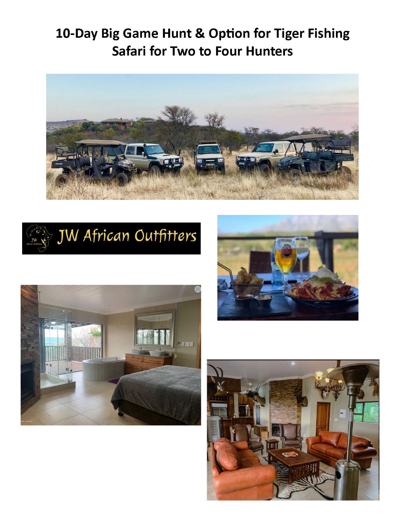 JW African Outfitters has donated an incredible 7-day South African Safari package for 2 to 4 hunters that includes trophy fees for a premium trophy for each hunter and an optional Tiger Fishing excursion. This safari package is for 2 to 4 hunters for 7 days and includes trophy fees for: 1x Sable, 1x Golden Wildebeest, 1x Nyala, 1x Waterbuck. lf less than 4 hunters attend, the 2 or 3 hunters may each select one species from the list. Hunters may also extend the hunt for 3 additional days of Tiger Fishing on the Jozini Lake at $1000/person.