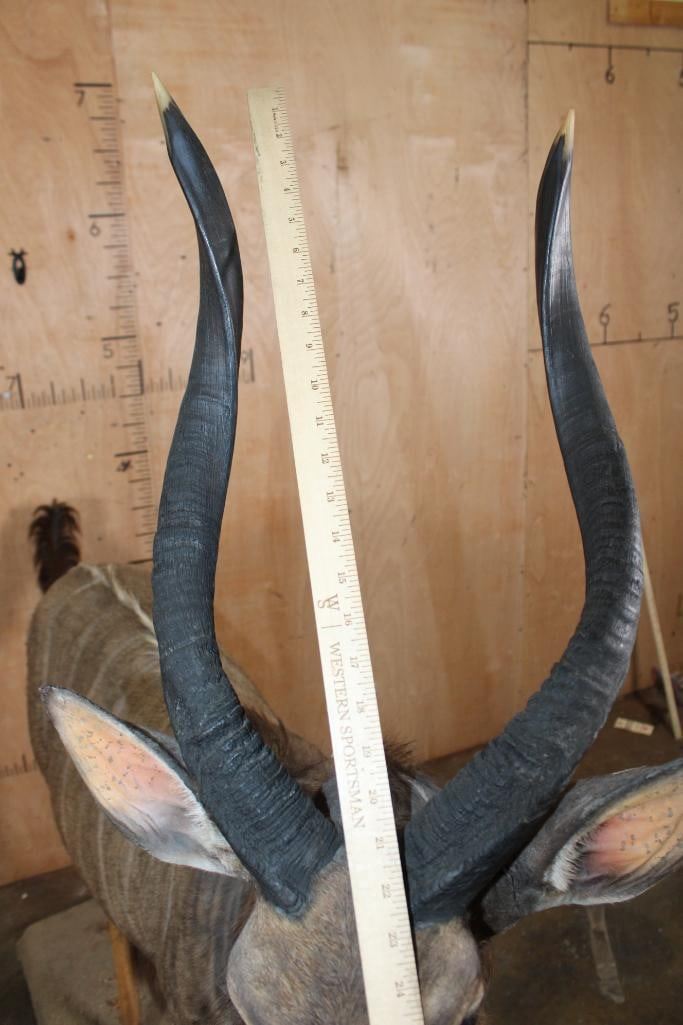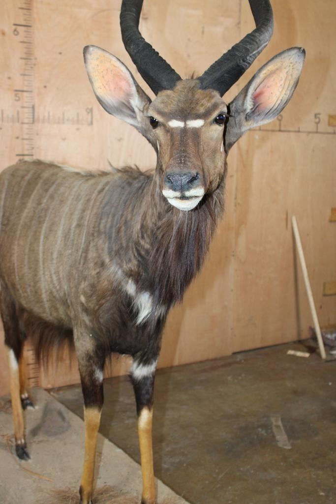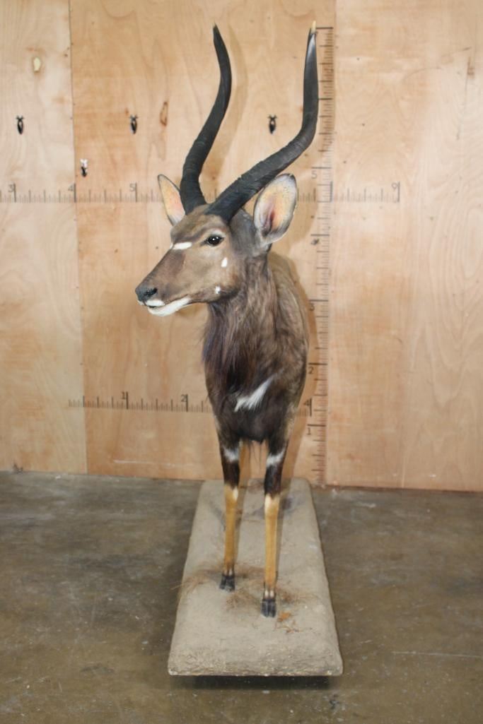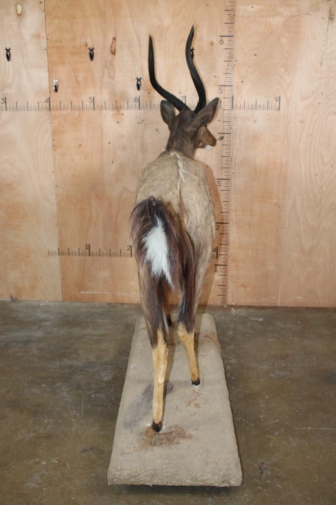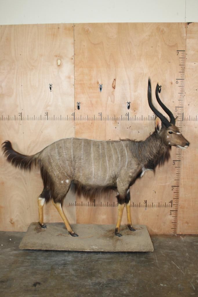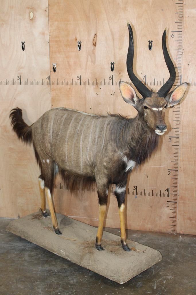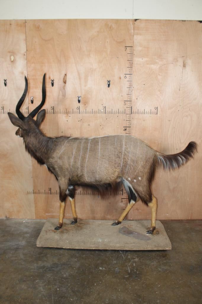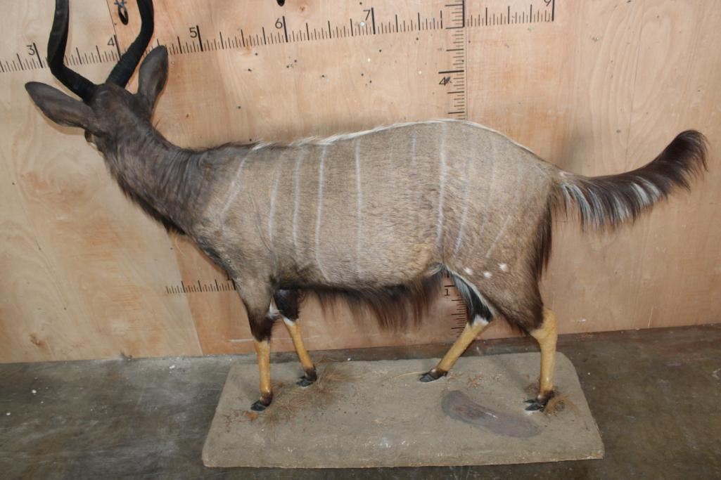 Big and Nice Life-sized NYALA on a Base with Wheels. The Left Horn measures 25.25" Long and the Right Horn measures 25 1/8" Long. It is in Good Condition. TAXIDERMY