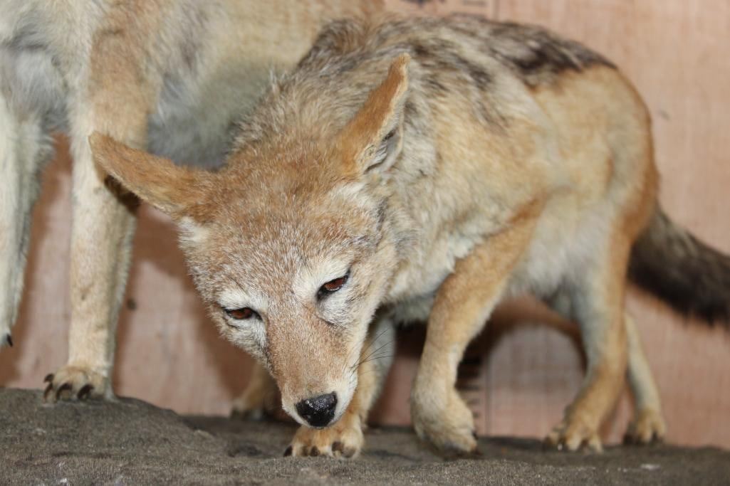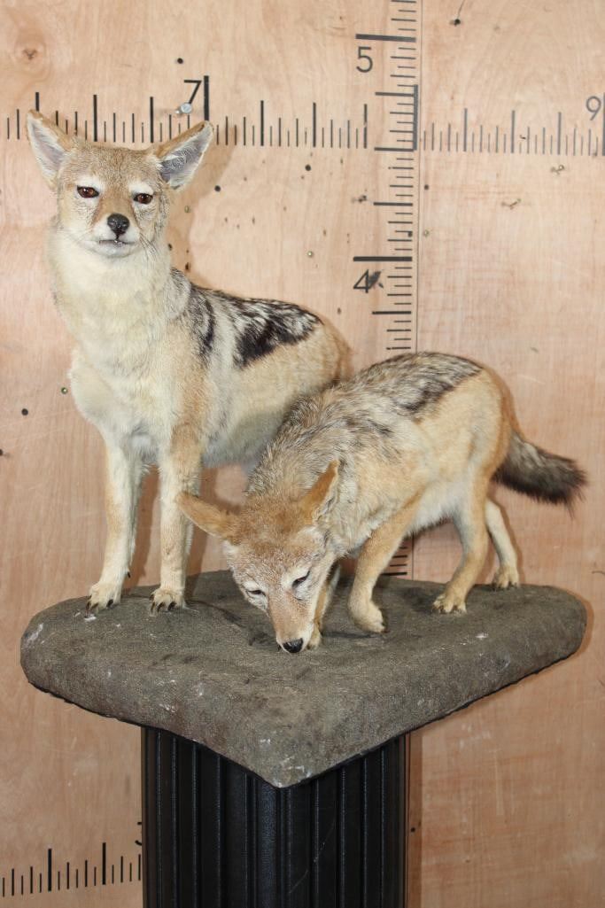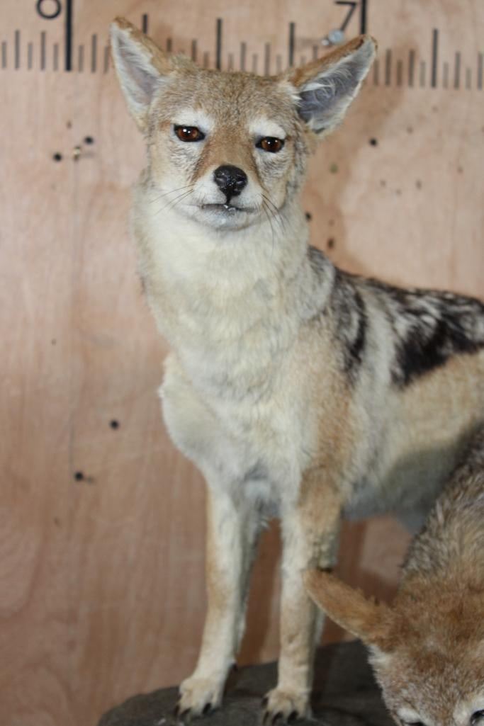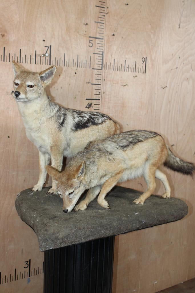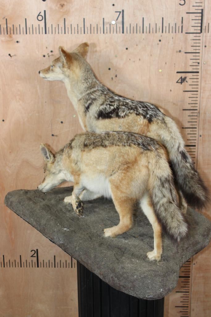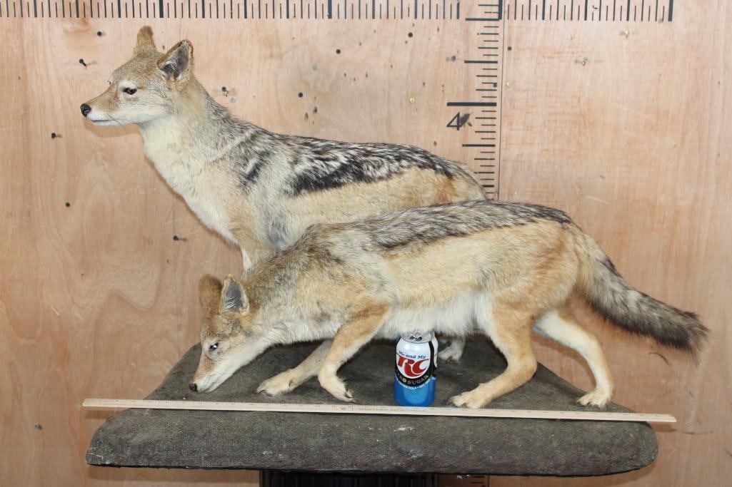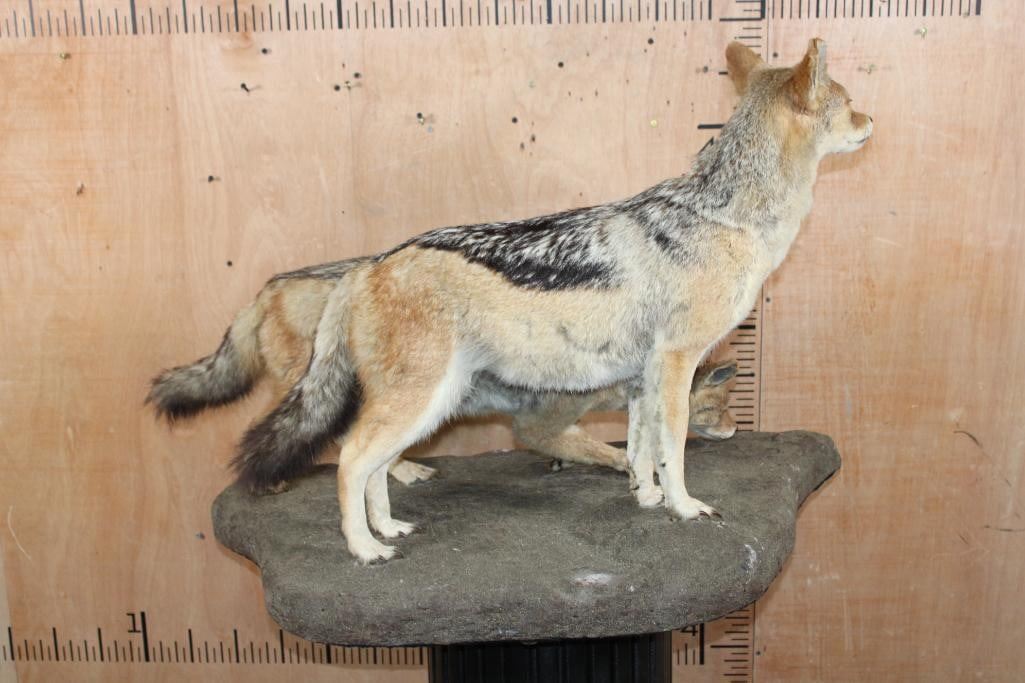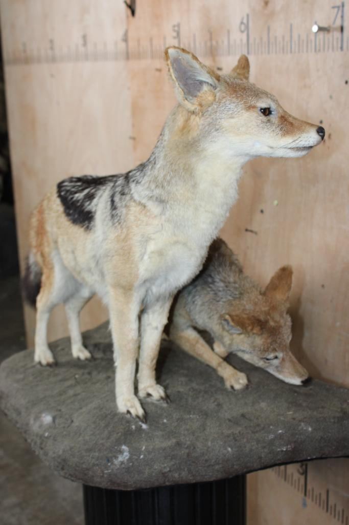 2 Very Nice Life-sized BLACK-BACKED JACKALS. They are mounted on a Natural Base and measure 35" Long x 21" Wide x 25" Tall. They are in Good Condition. TAXIDERMY