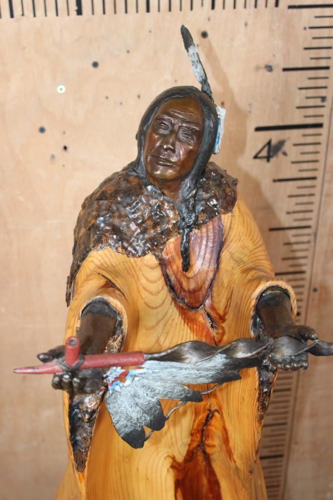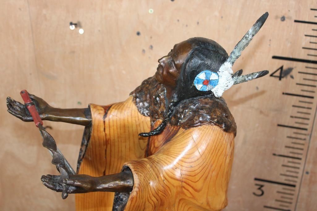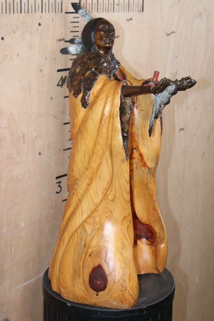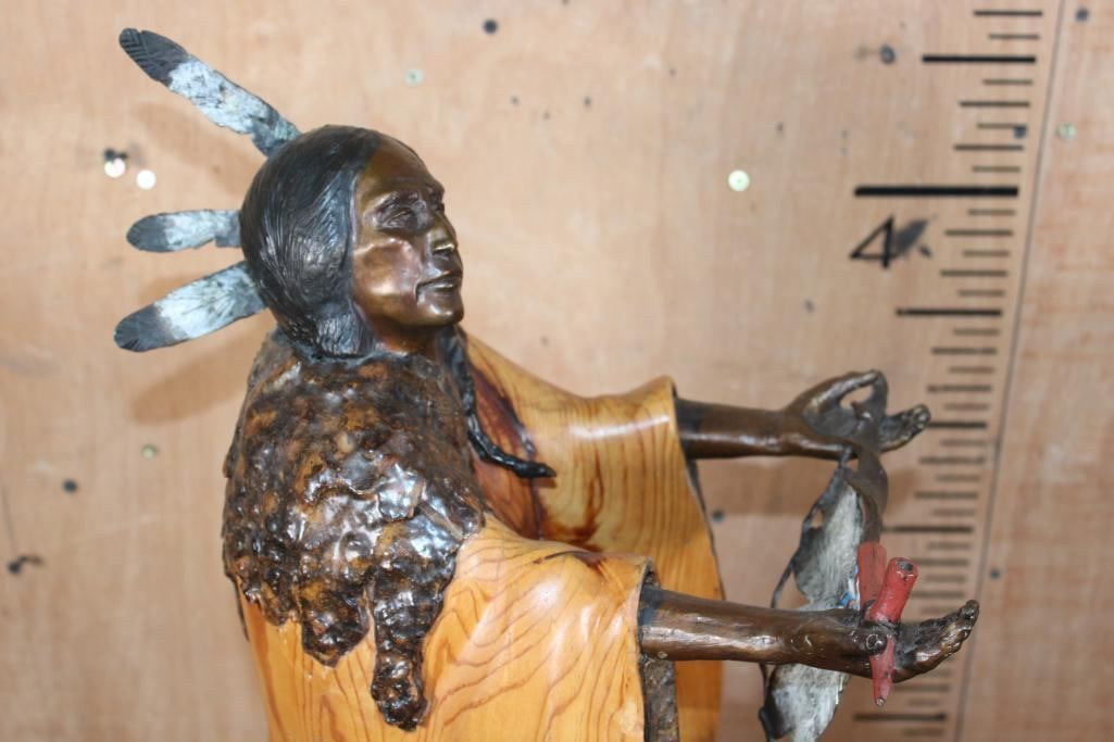 XL Incredible Original Bronze and Hand-carved Wood Sculpture "Honor Your Mother". It is Numbered #6/10 with a Maker's Mark. It measures 25" Tall x 11" Long x 10" Wide and Weighs 22 lbs 3 oz. The head, arms, and peace pipe are Bronze and hand-painted. COLLECTIBLE NATIVE AMERICAN BRONZE SCULPTURES