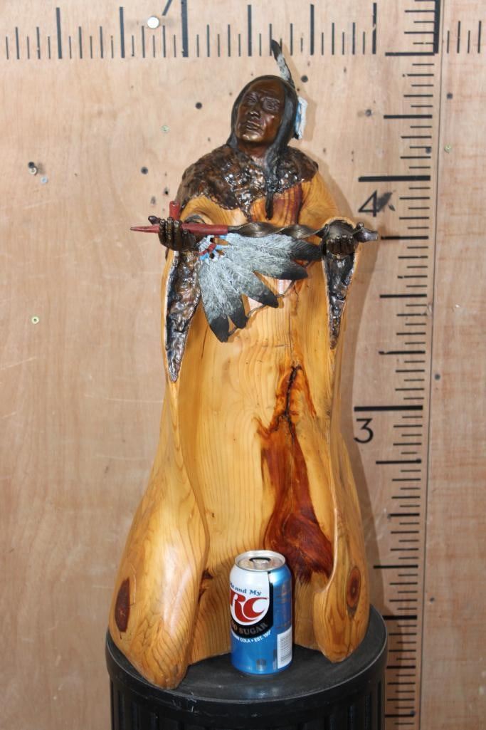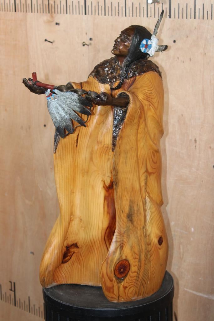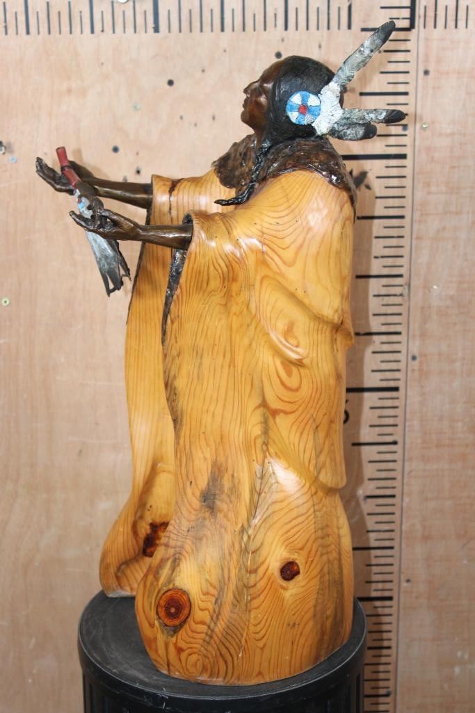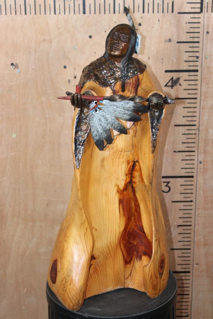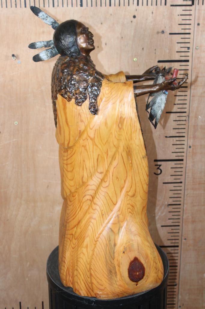 XL Incredible Original Bronze and Hand-carved Wood Sculpture "Honor Your Mother". It is Numbered #6/10 with a Maker's Mark. It measures 25" Tall x 11" Long x 10" Wide and Weighs 22 lbs 3 oz. The head, arms, and peace pipe are Bronze and hand-painted. COLLECTIBLE NATIVE AMERICAN BRONZE SCULPTURES